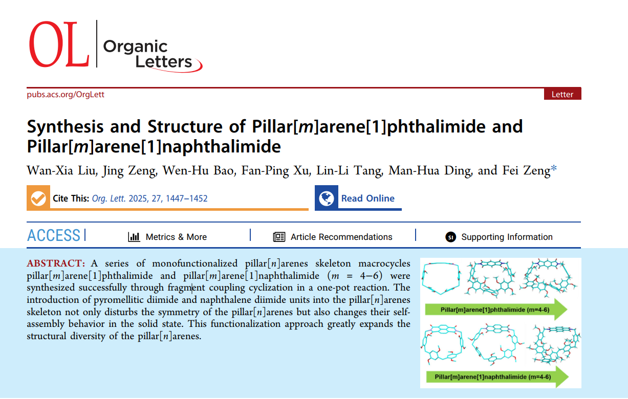 (本网讯 曾飞)近日,化学与生物工程学院2022级化学专业本科生刘晚霞以第一作者身份在国际知名期刊Organic Letters(中科院一区TOP)上发表题为《Synthesis and Structure of Pillar[m]arene[1]phthalimide and Pillar[m]arene[1]naphthalimide》(柱[m]芳烃[1]苯邻二甲酰亚胺与柱[m]芳烃[1]萘二甲酰亚胺的合成及结构)的高水平科研论文,是我校本科生人才培养质量进一步提升和学科专业建设的标志性成果。