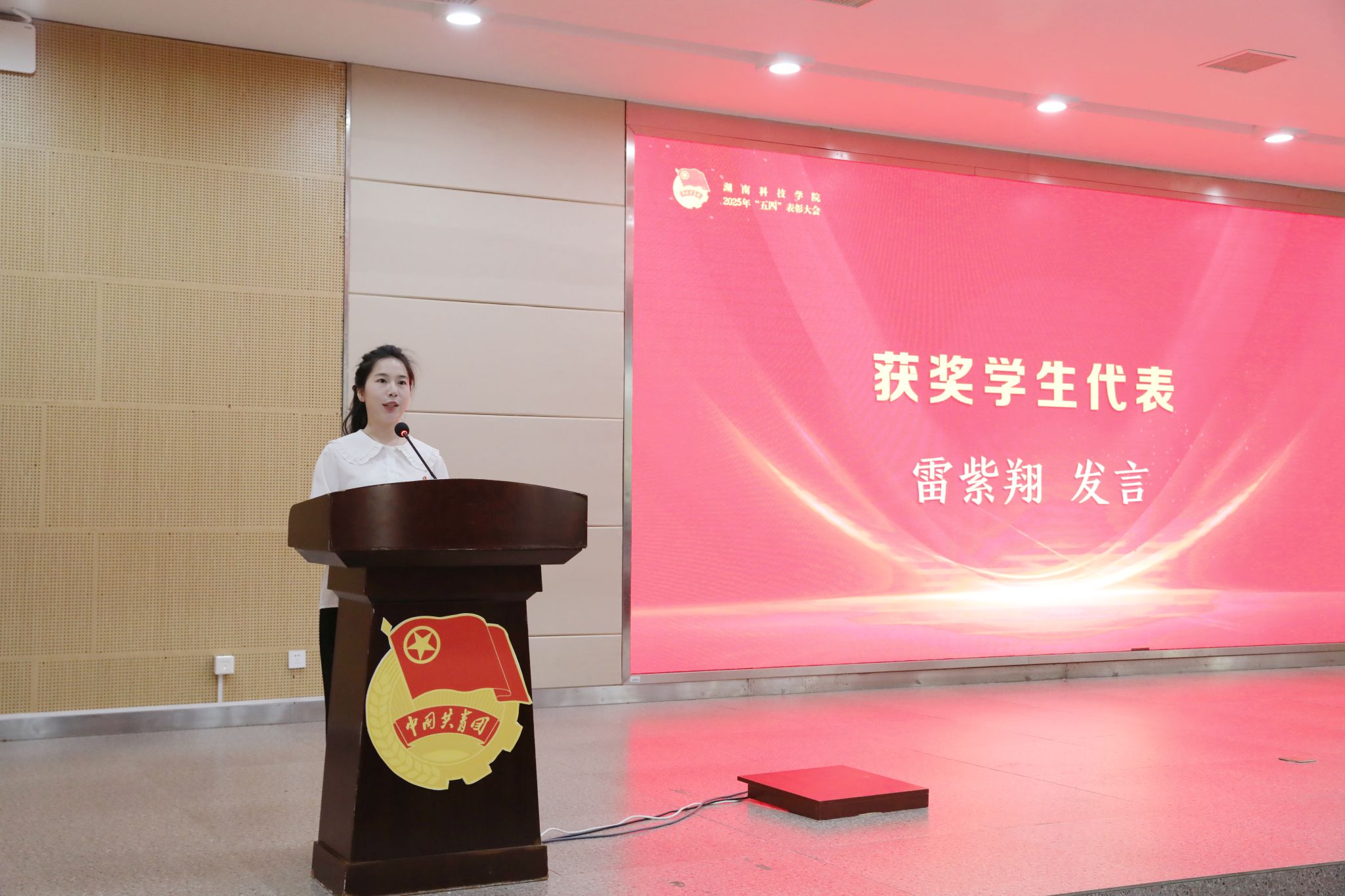 “创新创业之星”奖项获得者、文法学院雷紫翔作为获奖学生代表进行发言,讲述了自己坚持在校园里追梦、在创业中发光的事迹与感悟。