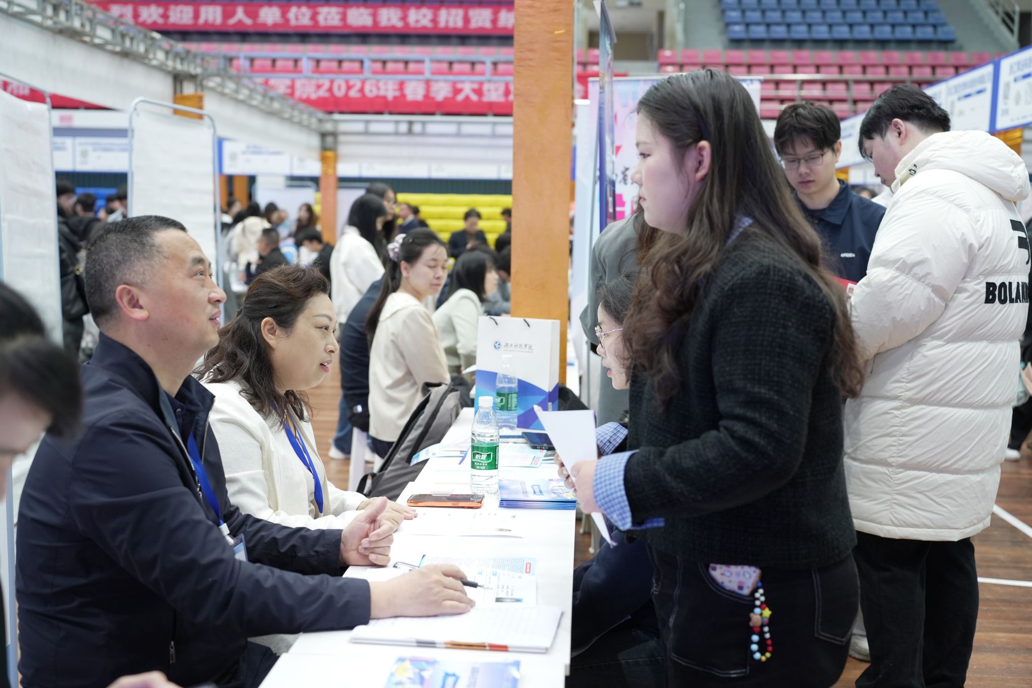 双选会现场秩序井然、氛围热烈。毕业生们在各展位前驻足交流、详细询问,积极与招聘方沟通并主动投递简历。“希望找到专业对口、发展稳定的平台。”国学2201班学生尹集文表示。