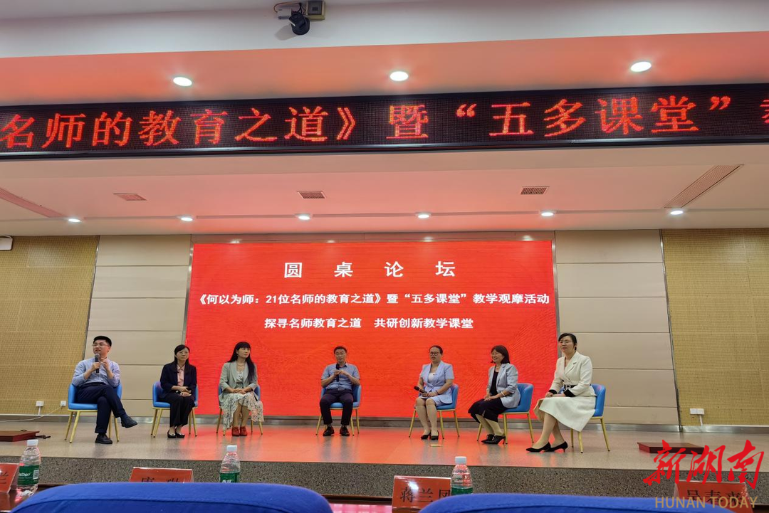 广东技术师范大学吴国珍教授在现场评课中表示,“五多课堂”教学思想突破传统教学范式,实现知识传授与价值引领的有机融合,为语文教学改革树立新标杆。在圆桌论坛环节,吴春来与多位教育专家围绕“名师成长之道”展开深度对话,围绕教师自我发展、课堂教学模式创新等话题与现场观课的师生进行了互动交流,专家们分享了自己的教育故事和经验,为广大师生提供了实践参考。永州市高中语文李苏芳名师工作室首席名师李苏芳老师分享了自己二十多年的教育历程,她的 “纯粹的心,做纯粹的事”的执着精神,感染了现场所有的青年教师。