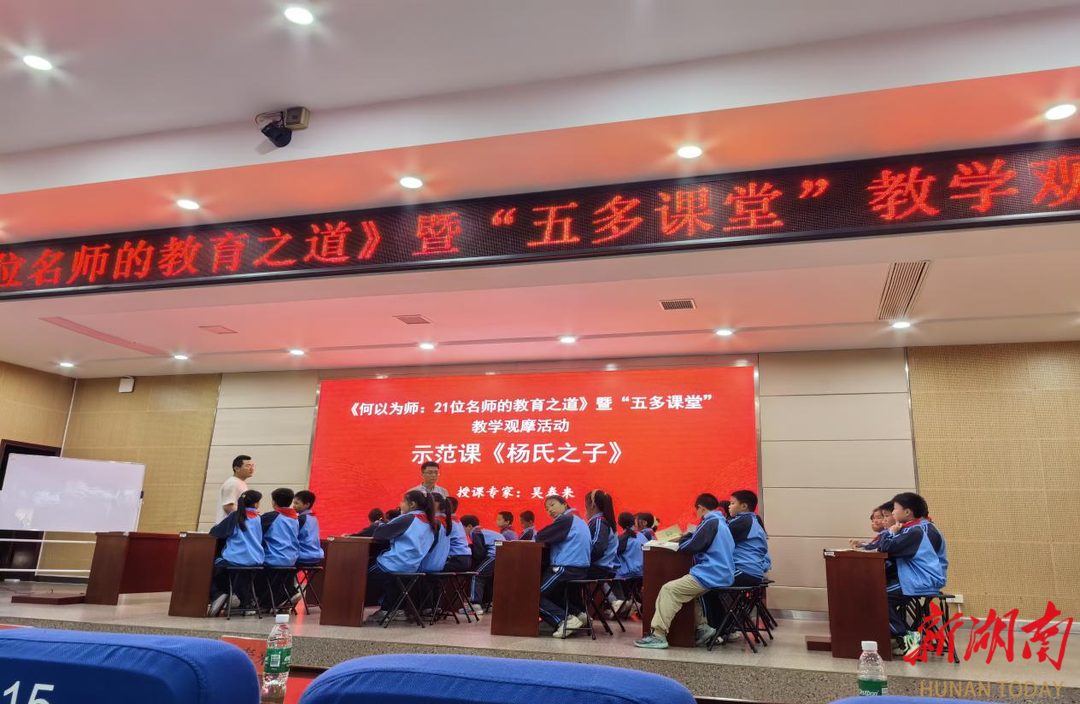 会上,为新书《何以为师:21位名师的教育之道》揭牌。在示范课观摩环节,吴春来执教《杨氏之子》,生动诠释了“五多课堂”教学思想的实践魅力。课堂中师生坦诚互动、平等对话,充分展现学生主体地位,促进了孩子们在课堂上的成长蜕变。
