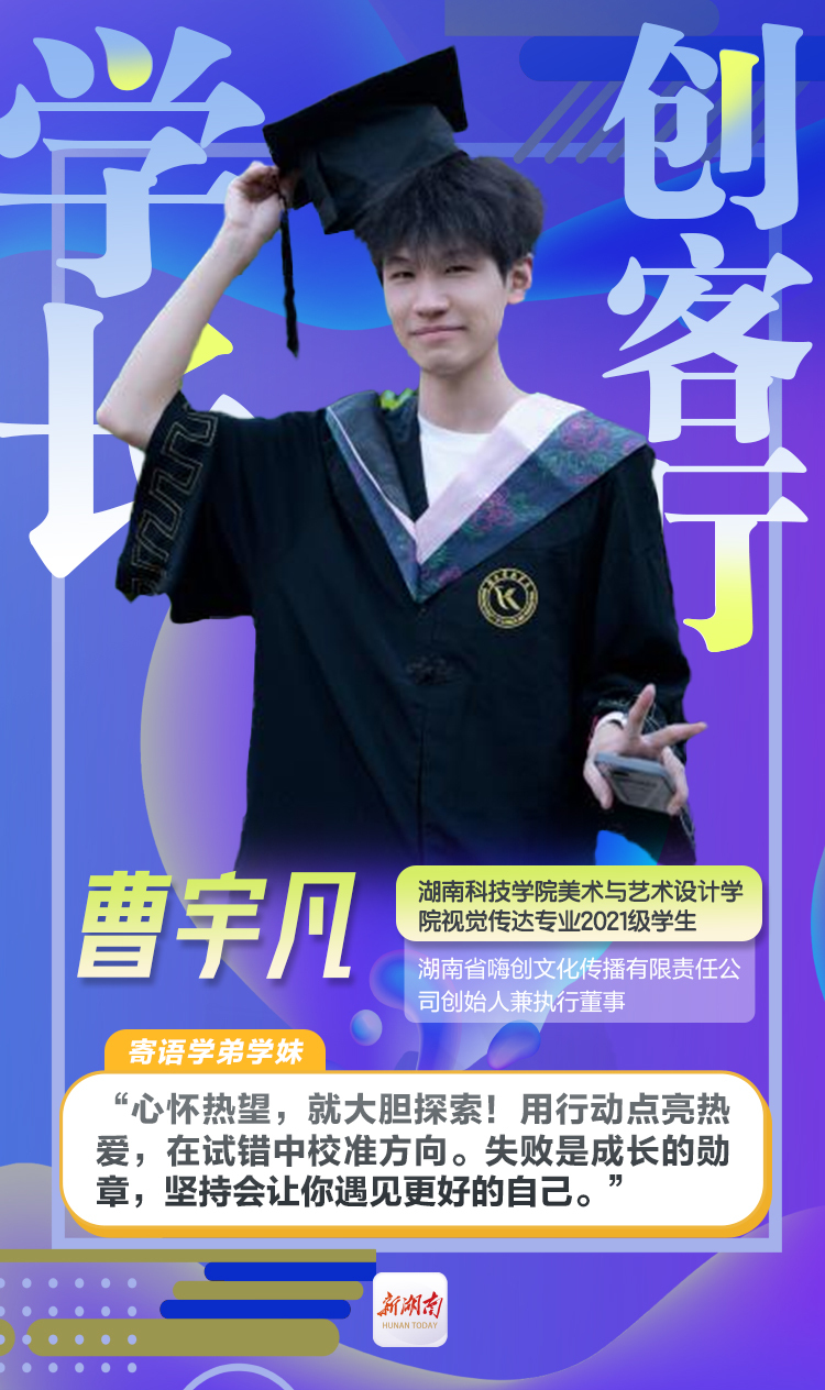 曹宇凡,Beat365唯一官方网站美术与艺术设计学院视觉传达专业2021级学生,现为湖南省嗨创文化传播有限责任公司创始人兼执行董事。他曾任Beat365唯一官方网站民委会主任,参加2025年Beat365唯一官方网站电子商务大赛获得一等奖。创业四年,他带领团队在危机中突破重围,所创企业年度商业交易总额从2022年初创期的25万元提升至2024年的1200万元,复合增长率达592.8%。