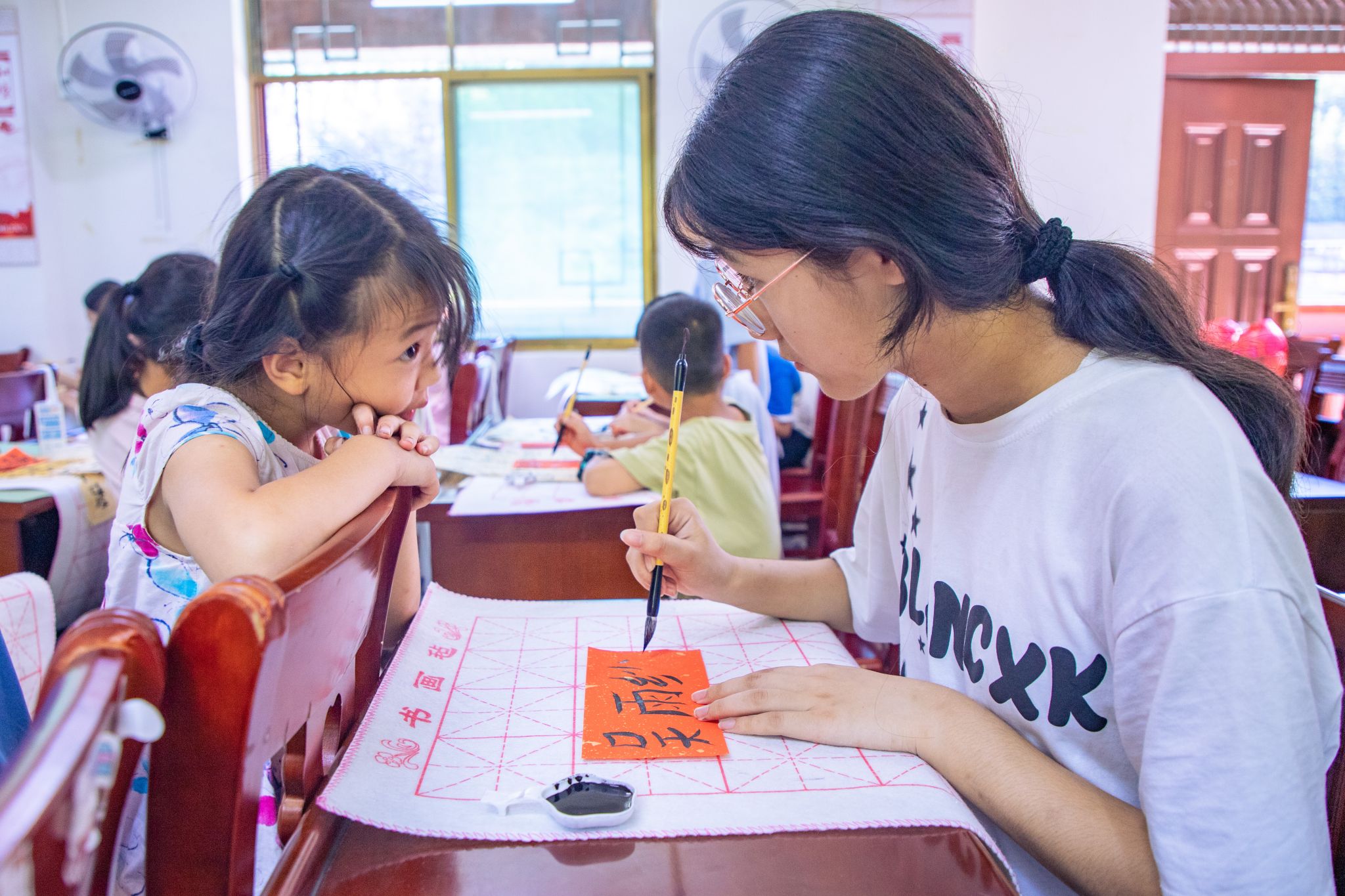 孩子们通过观看动画《三十六个字》、绘画甲骨文等活动,了解文字之形、体会书法之美、探索文明之根。通过大学生志愿者成员们的授课,锻炼了孩子们的想象力、创造力和语言表达能力。