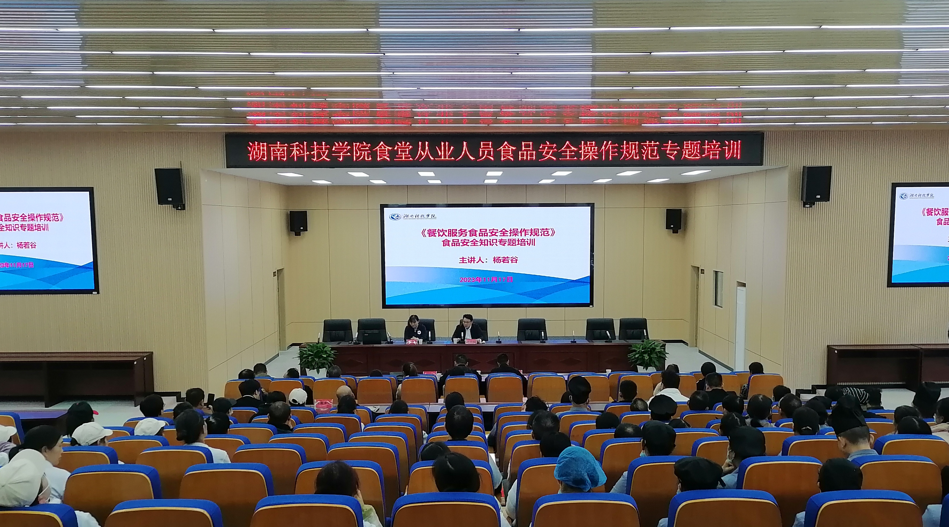 本网讯 11月17日下午,后勤服务中心邀请永州市市场监督局餐饮服务食品安全监督科科长杨若谷、零陵区市场监督管理局餐饮服务食品安全监督管理股股长胡俊文来我校开展食品安全操作规范专题培训。学校食品安全员、各食堂管理人员及食堂所有从业人员参加培训,本次培训由后勤服务中心副主任张建军主持。