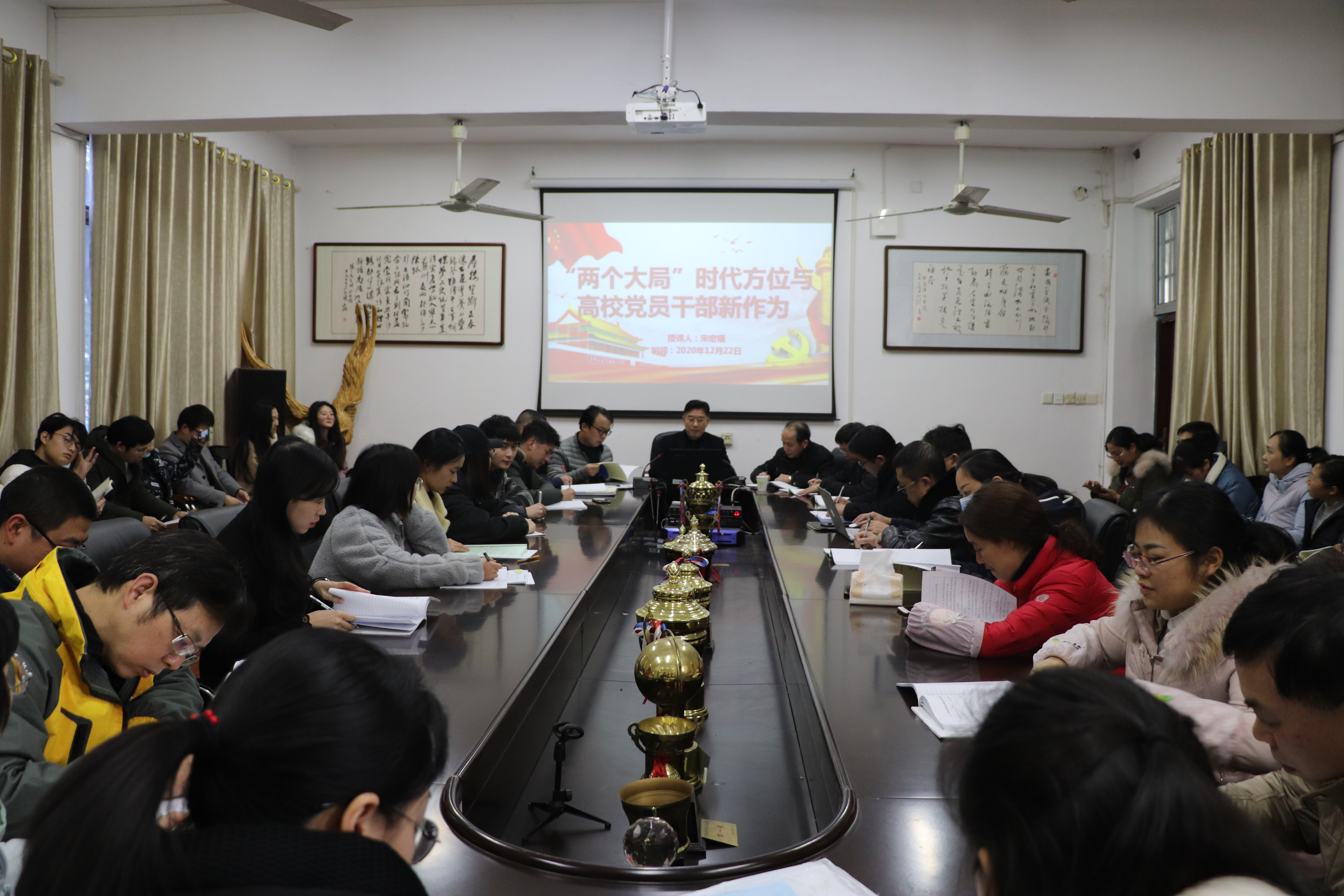 本网讯 12月22日上午,副校长宋宏福在明德楼为人文与社会科学学院、国学院党员上题为《两个大局时代方位与高校党员干部新作为》的专题党课。
