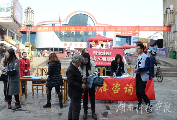 本网讯(通讯员 龙夏萍)3月28日上午,我校人文与社会科学学院法律服务中心协同零陵区妇联、零陵区司法局在零陵商业城向市民宣传《反家庭暴力法》。