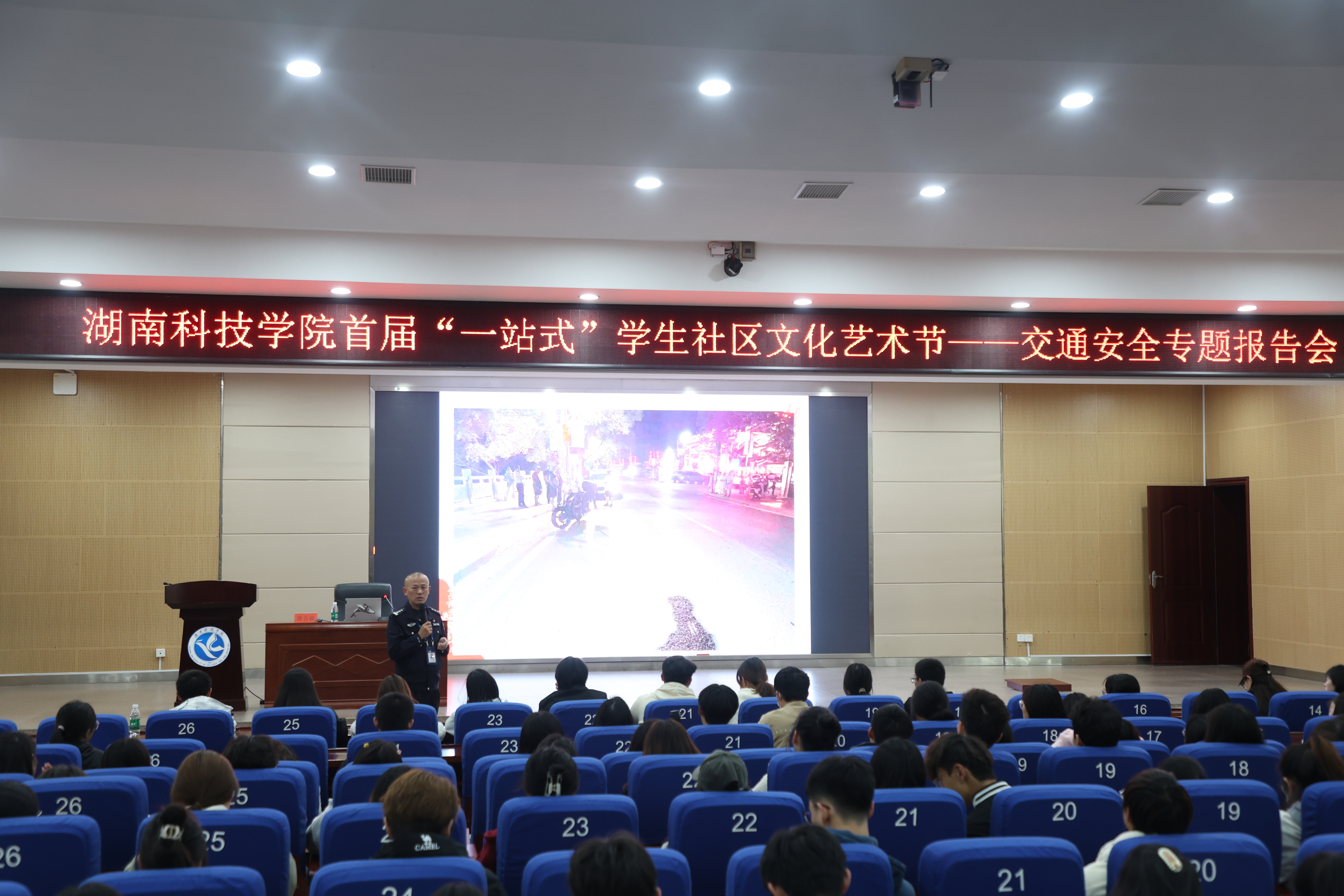 本网讯 为提升我校学生交通安全意识,普及交通安全常识,10月26日晚,Beat365唯一官方网站交通安全专题报告会在潇湘大讲堂举行,会议邀请零陵区交警大队队长唐合民主讲,600多学生参加。