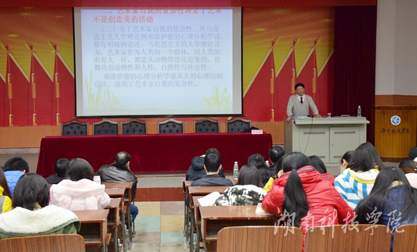 本网讯(记者 涂楚琪 覃雅君)12月15日晚,中国比较文学学会理事、全国马列文论研究会常务理事兼副秘书长、湘潭大学文学与新闻学院原院长季水河教授莅临我校讲学,作题为“美与艺术关系论的历史考察”学术讲座。讲座由校党委委员、工会主席陈仲庚主持,该院院长潘雁飞等参加。