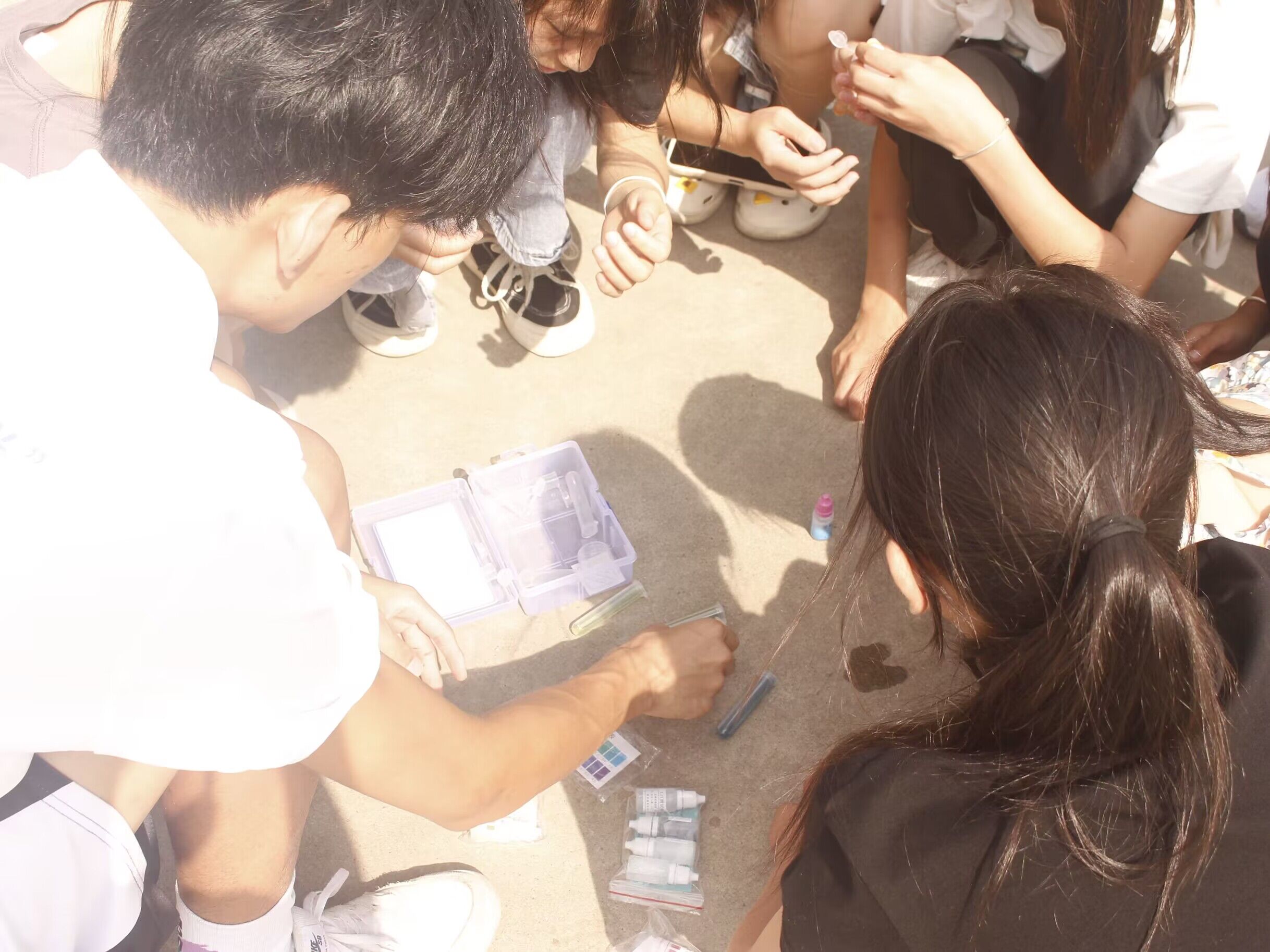 为构建青少年儿童们健康成长的生活环境,团队对学校厨房用水、周围河流的水质情况进行采样,通过自己的专业知识,利用试剂检测水的溶解氧、酸碱度等,直观反映出学校用水的水质情况。为激发小朋友们求知求真的好奇心,探索科学领域的热情,实践团成员手把手带领导小朋友们进行水质检测小实验,体验科学的乐趣。