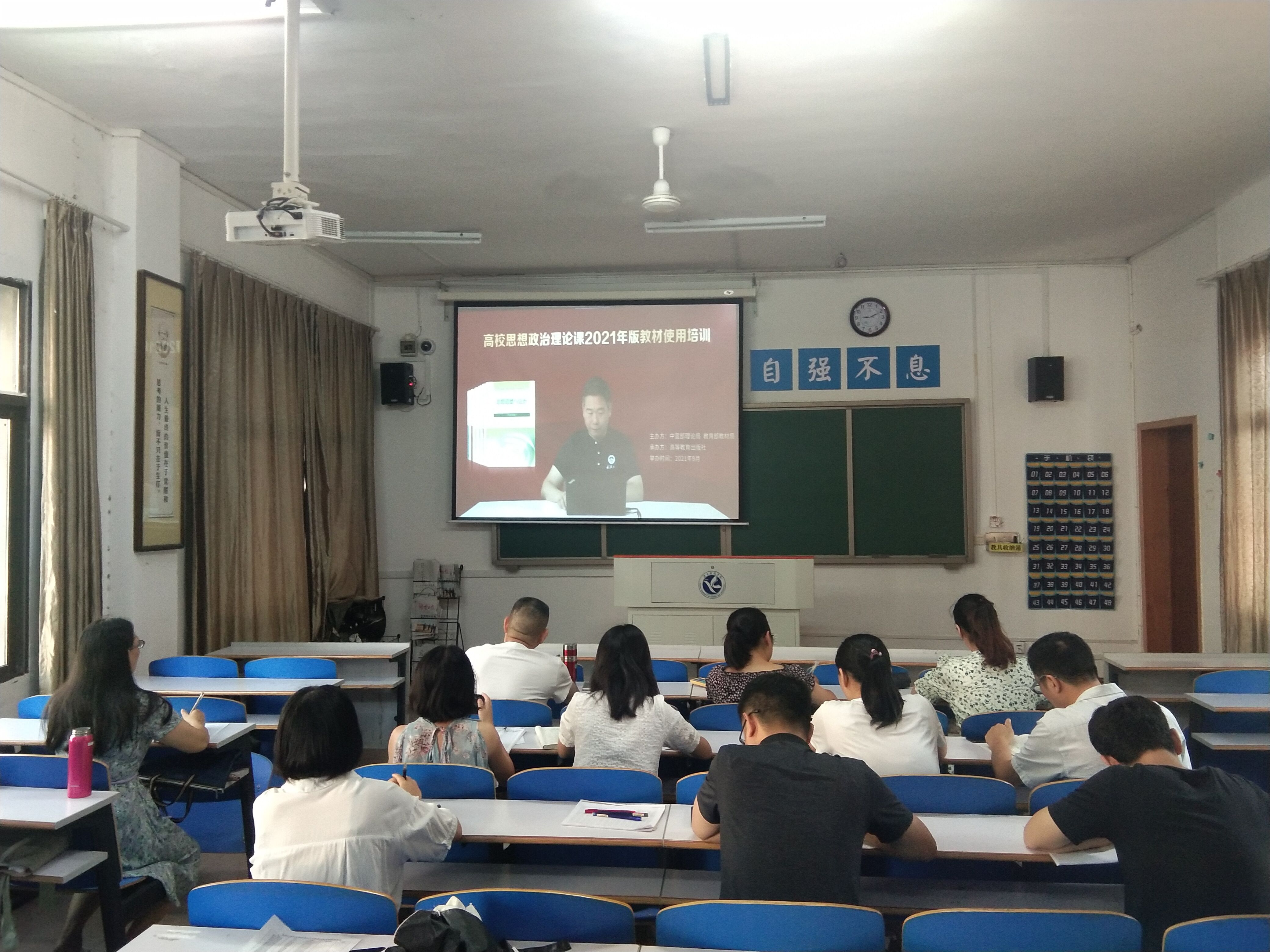 本网讯 9月27日至29日,由教育部、中宣部联合举办,高校思想政治理论课程研究中心、全国高校教师网络培训中心承办的“高校思想政治理论课2021年版教材使用培训”正式开班。我校马克思主义学院组织全体思政教师集中观看了网络直播培训学习。