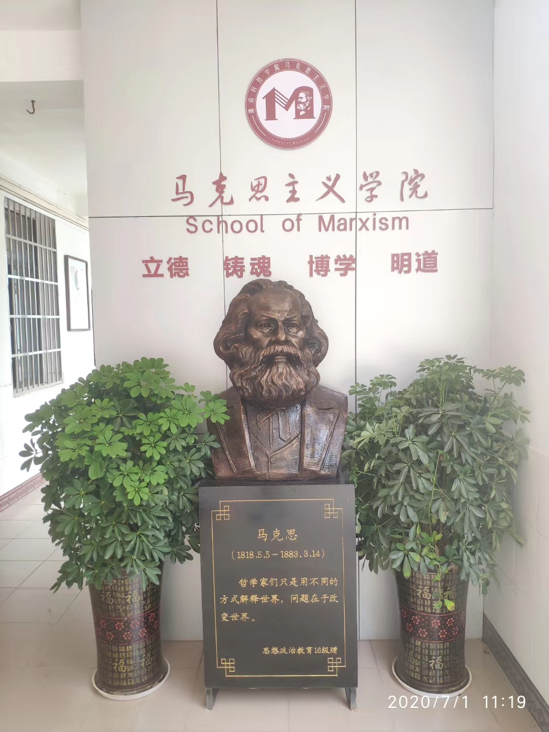 本网讯 7月1日,马克思主义学院2020届毕业生向学院捐赠了一尊马克思雕像,以此感谢母校的教育和培养。
