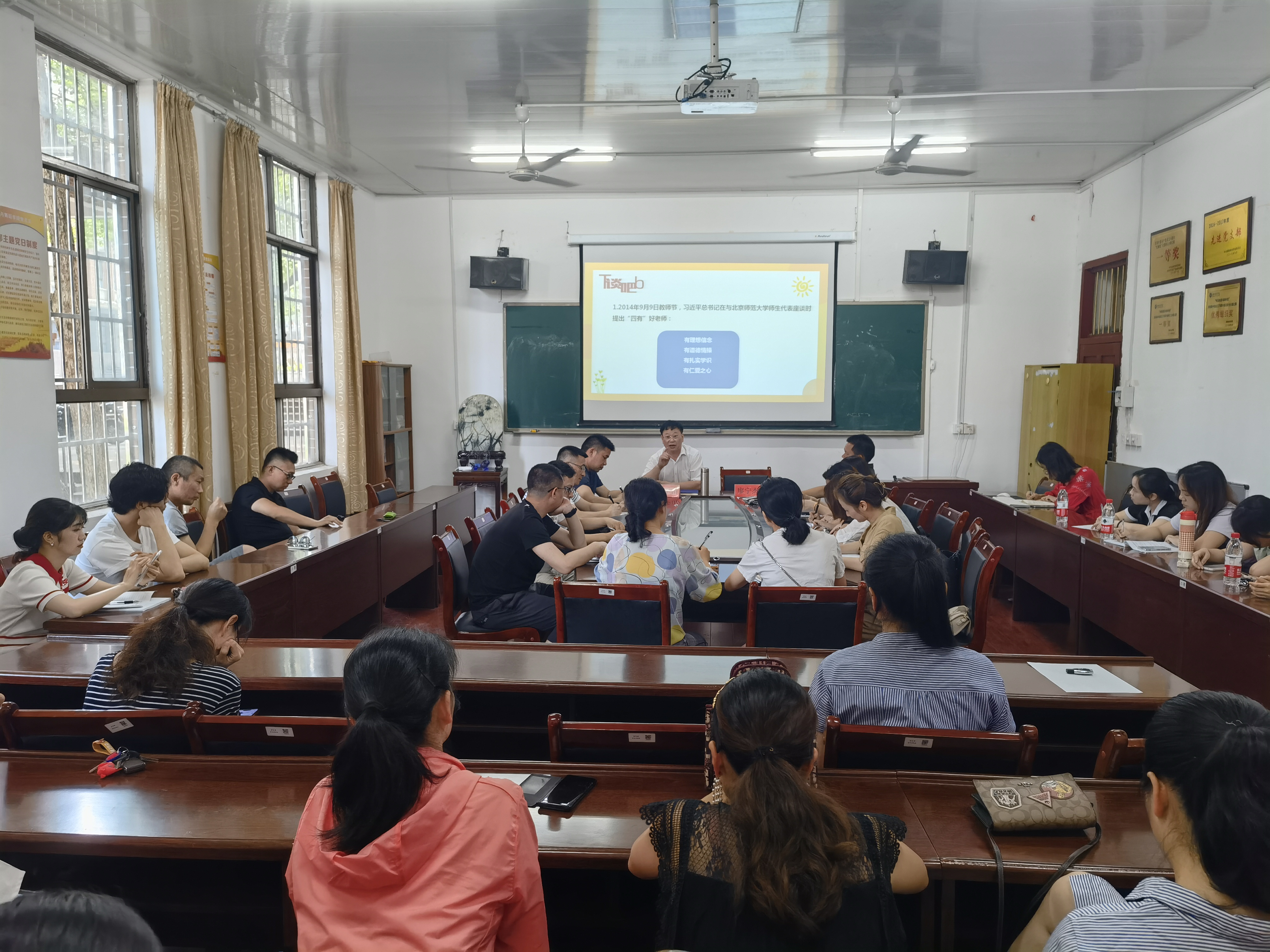 唐华山部长指出要把握好“四有”好老师的时代价值,牢记学高为师、身正为范的要求,做到以身作则、因材施教,成为一个师德高尚的好教师;他还结合自己的班主任工作和学生工作的经历,分别从眼里有人、心中有爱、肩上有责、管教有方、交往有度五个维度,阐述了如何做一个“有理想信念、有道德情操、有扎实学识、有仁爱之心”的好老师。