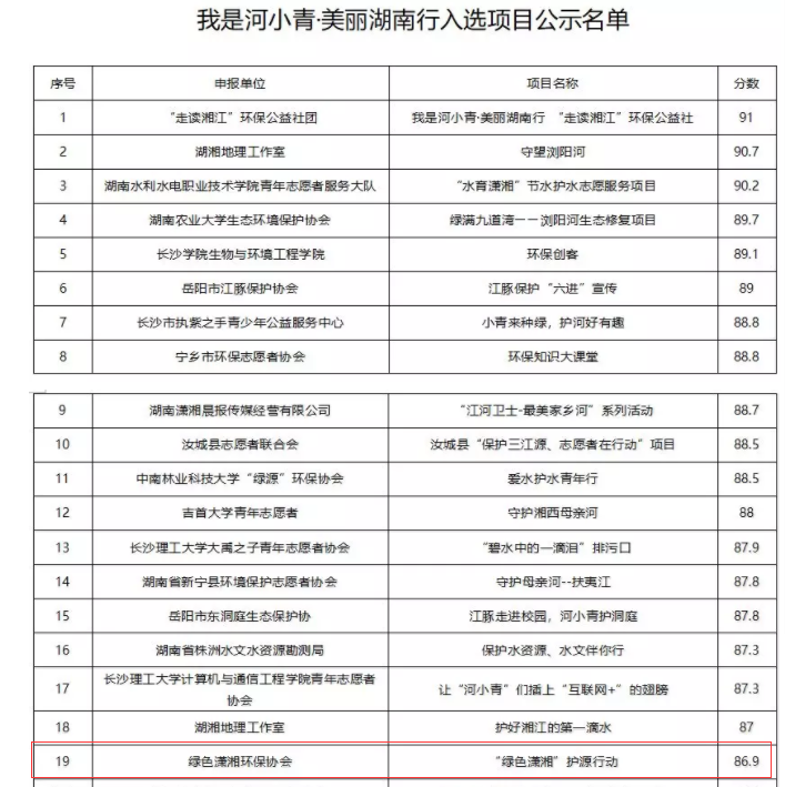 本网讯 6月30日,由共青团湖南省委、省水利局主办的“我是河小青·美丽湖南行”项目评审会在长沙举行,我校绿色潇湘环保协会的“绿色潇湘护源行动”项目从全省312个方案中脱颖而出,成功入选。