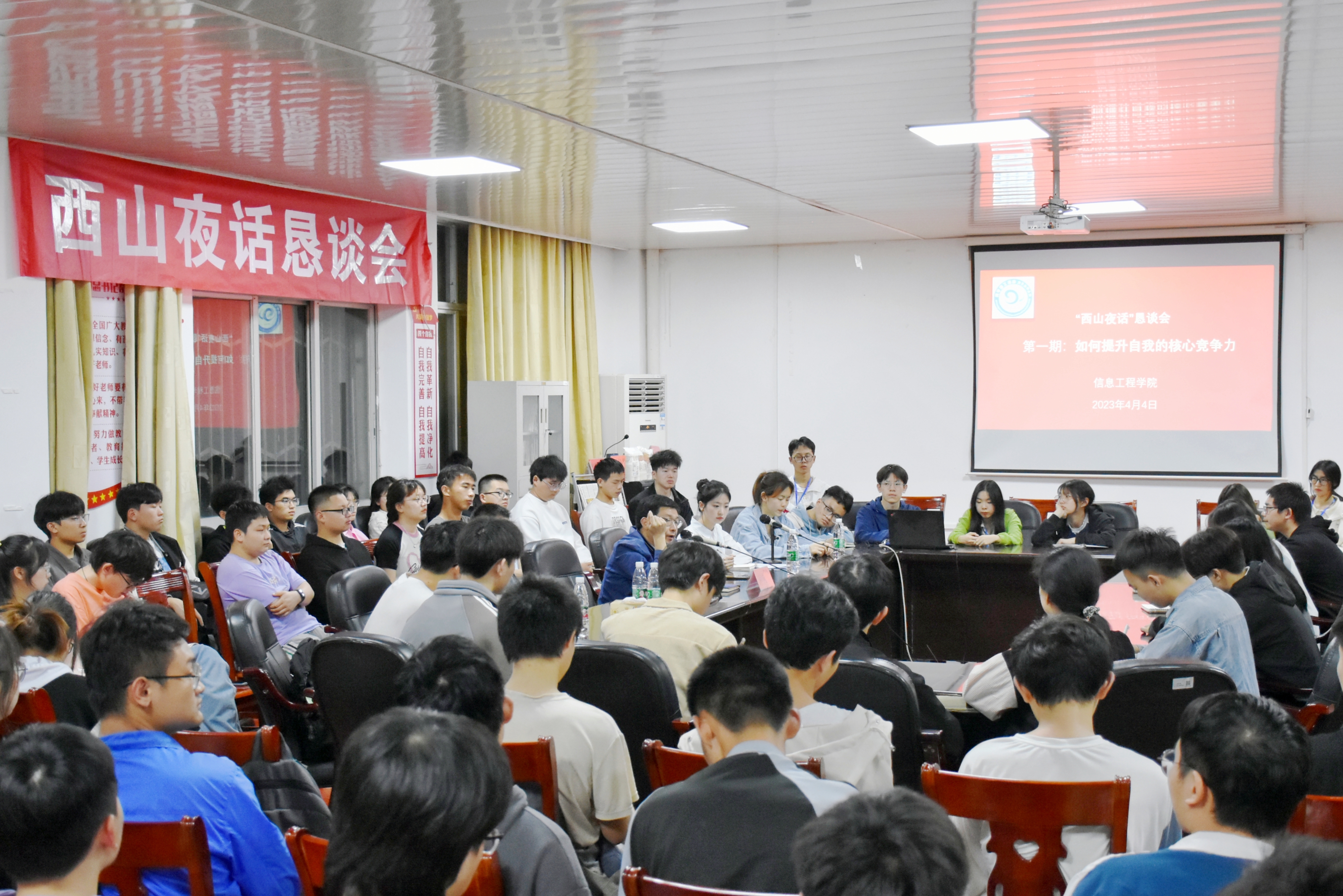 本网讯(通讯员 刘兵兵)4月4日,信息工程学院第一期“西山夜话”恳谈会如约而至,信息工程学院院长尹向东担任首场开谈嘉宾,来自信息工程学院各年级120余名学生参加,师生们围绕如何提升自我核心竞争力的主题,敞开心扉,畅所欲言,共话成长。