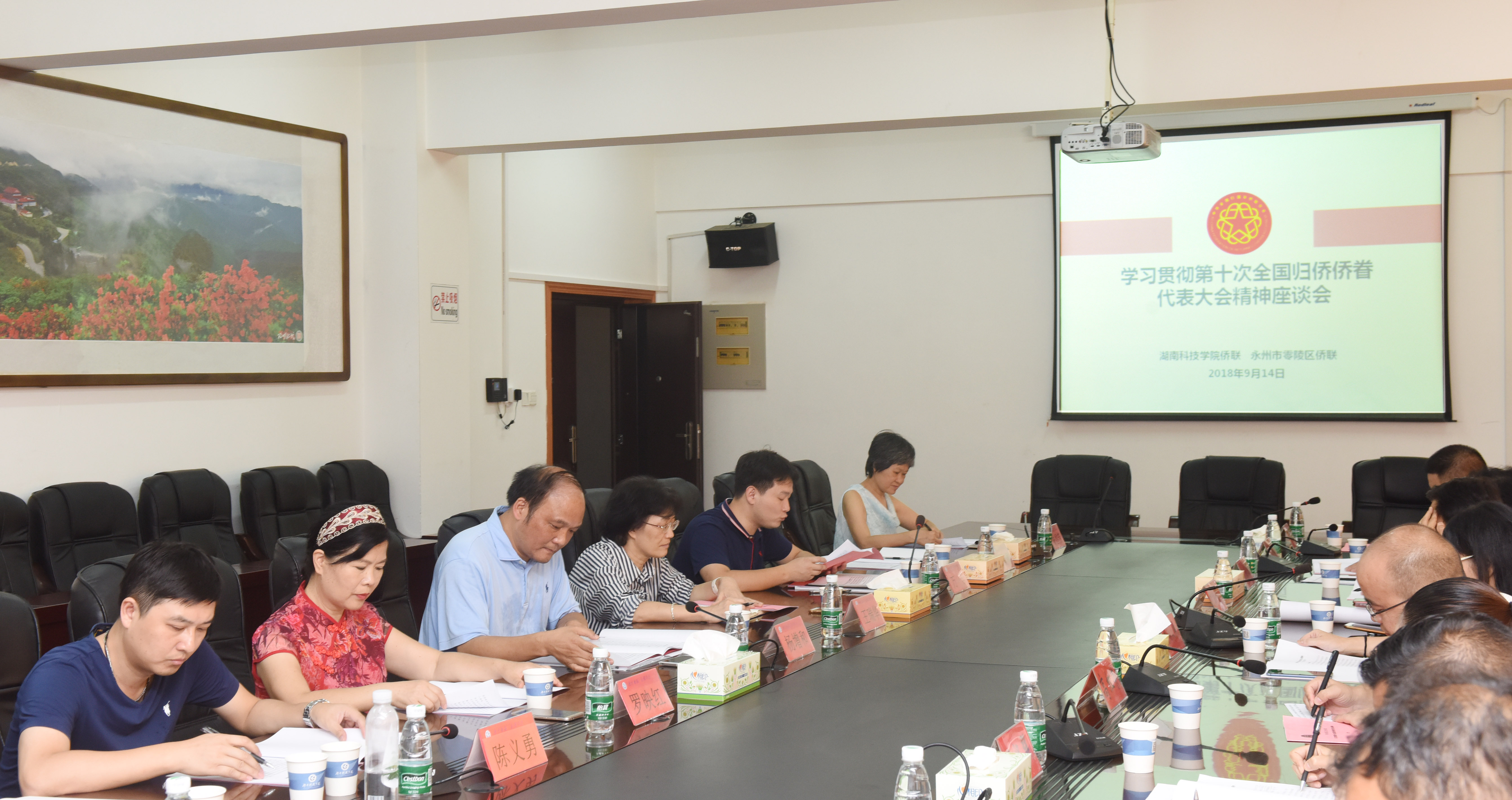 本网讯  9月14日,学校侨联联合零陵区侨联在校举行学习贯彻第十次全国归侨侨眷代表大会精神座谈会。零陵区侨联主席杨祝群主持,永州市侨联主席、传媒学院院长杨增和、零陵区委统战部常务副部长高红荣、校宣传统战部副部长王瑞华、校侨联主席万李以及校侨联全体委员及部分零陵区的侨企代表参加会议。