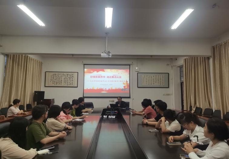 本网讯 为增强毕业生党员政治意识、规矩意识和廉洁意识,2月25日下午,文法学院党总支在明德楼203会议室举办2022届毕业生党员廉洁教育主题党日活动,学院党总支书记谷显明作题为“珍惜青春芳华,清正廉洁从业”主题讲座。