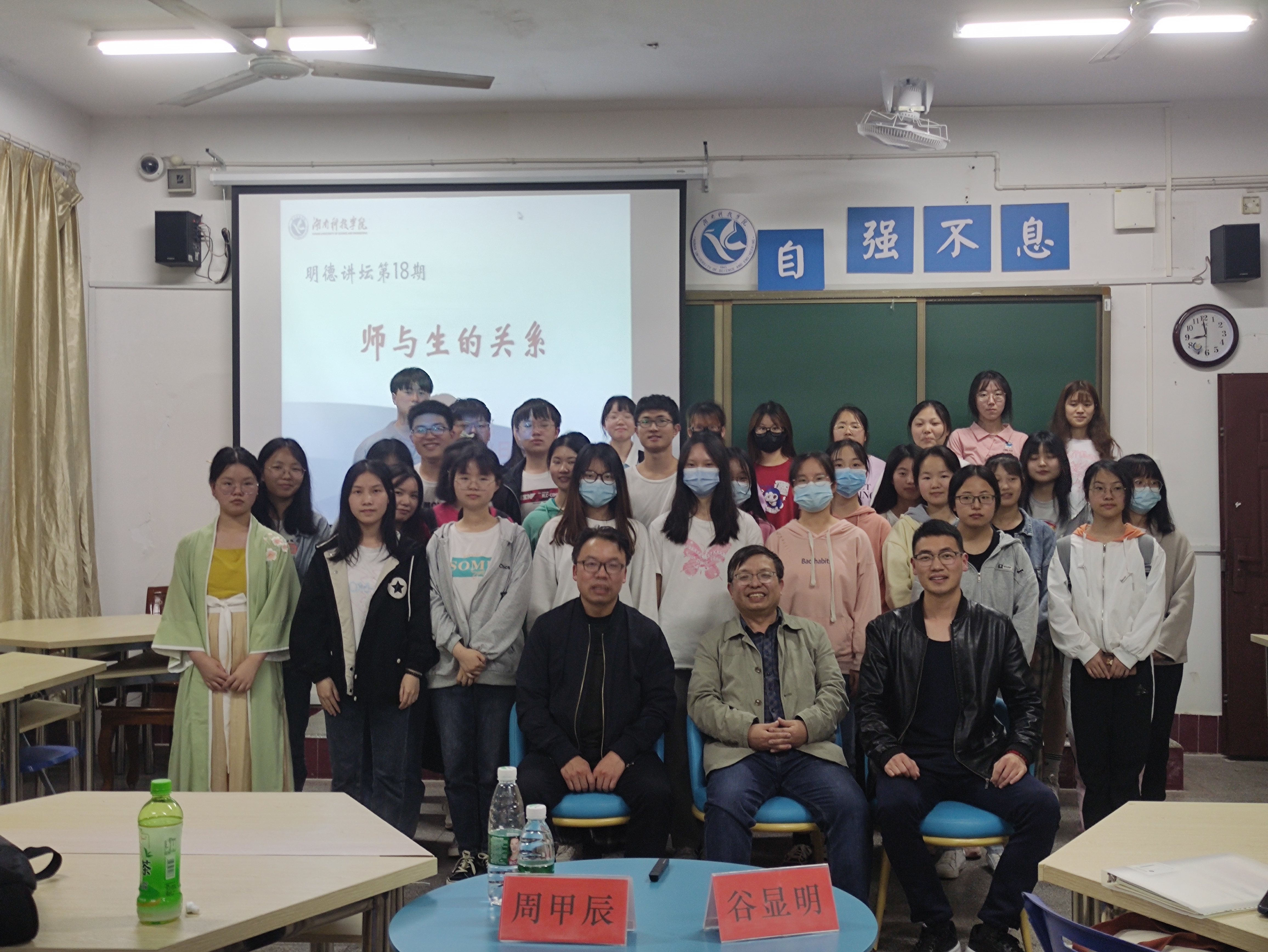 明德讲坛邀请到文法学院专职组织员周甲辰教授主讲“师与生的关系”,周甲辰结合自己的求学和工作经历,围绕“投缘、随和、平等、纯洁”关键词,与在座的青年学生畅谈师生关系。他指出,老师要有爱心,有责任感,潜心教书育人,引导学生学会读书、学会思考、学会做人;青年学子要有追求,有使命感,静心读书学习,积极与老师沟通,主动向老师请教,在潜移默化中学习书本上没有的东西。