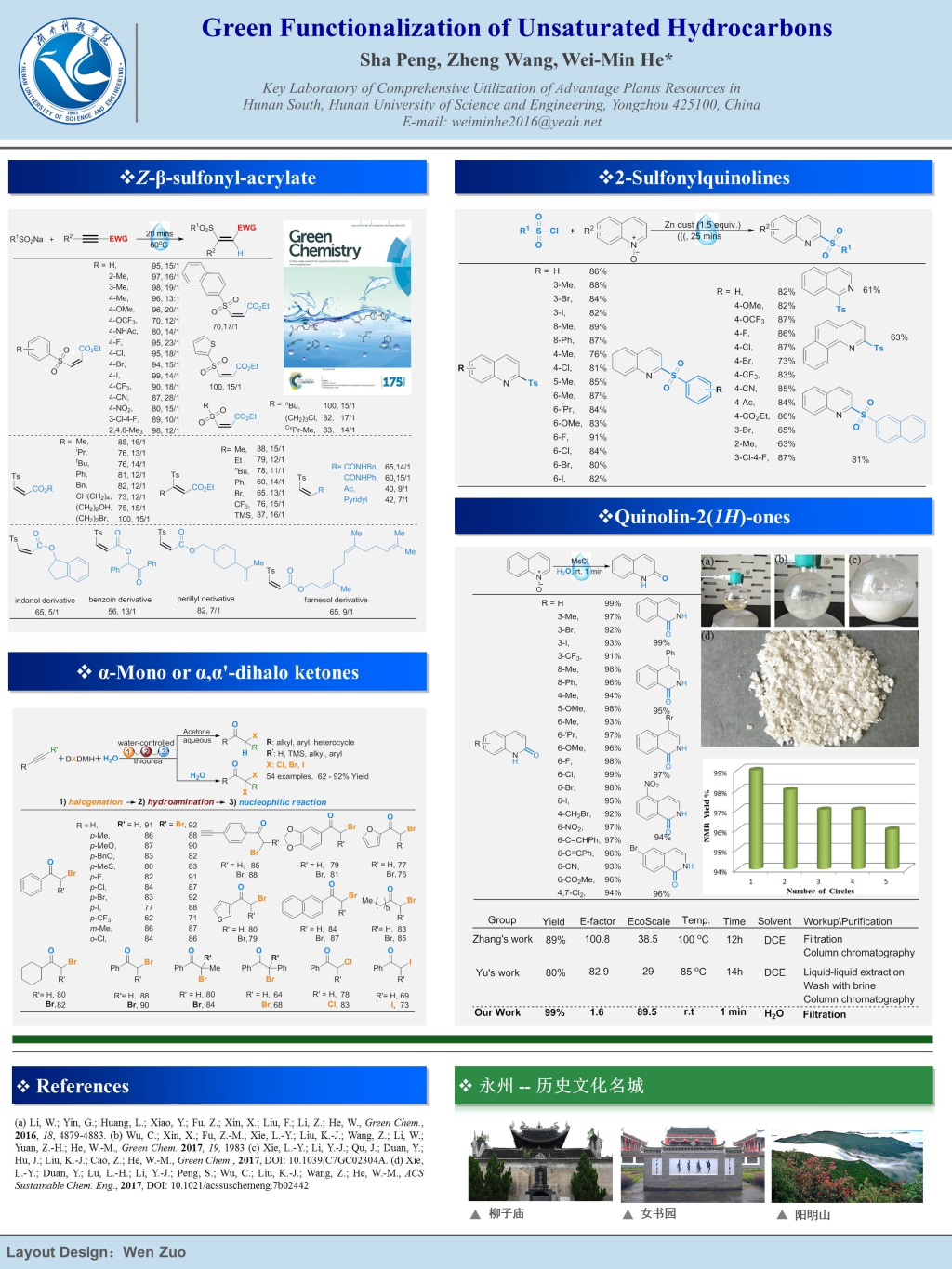 何卫民在报告中介绍了该课题组的主要工作,然后从水相炔烃绿色官能化反应、水相氮杂环化合物官能化反应等方面进行了工作阐述。报告结束后,何卫民与参会专家学者进行了深入交流与讨论,分享了最新研究成果,探讨绿色有机合成及其产业化研究新思路,为之后学校间的学术交流奠定了基础。此外,由我校教师左文设计、彭莎和王峥制作的学术墙报,不仅展示我校在绿色化学研究领域的成果,还将永州的风景名胜呈现给与会嘉宾,受到了与会专家的一致好评。