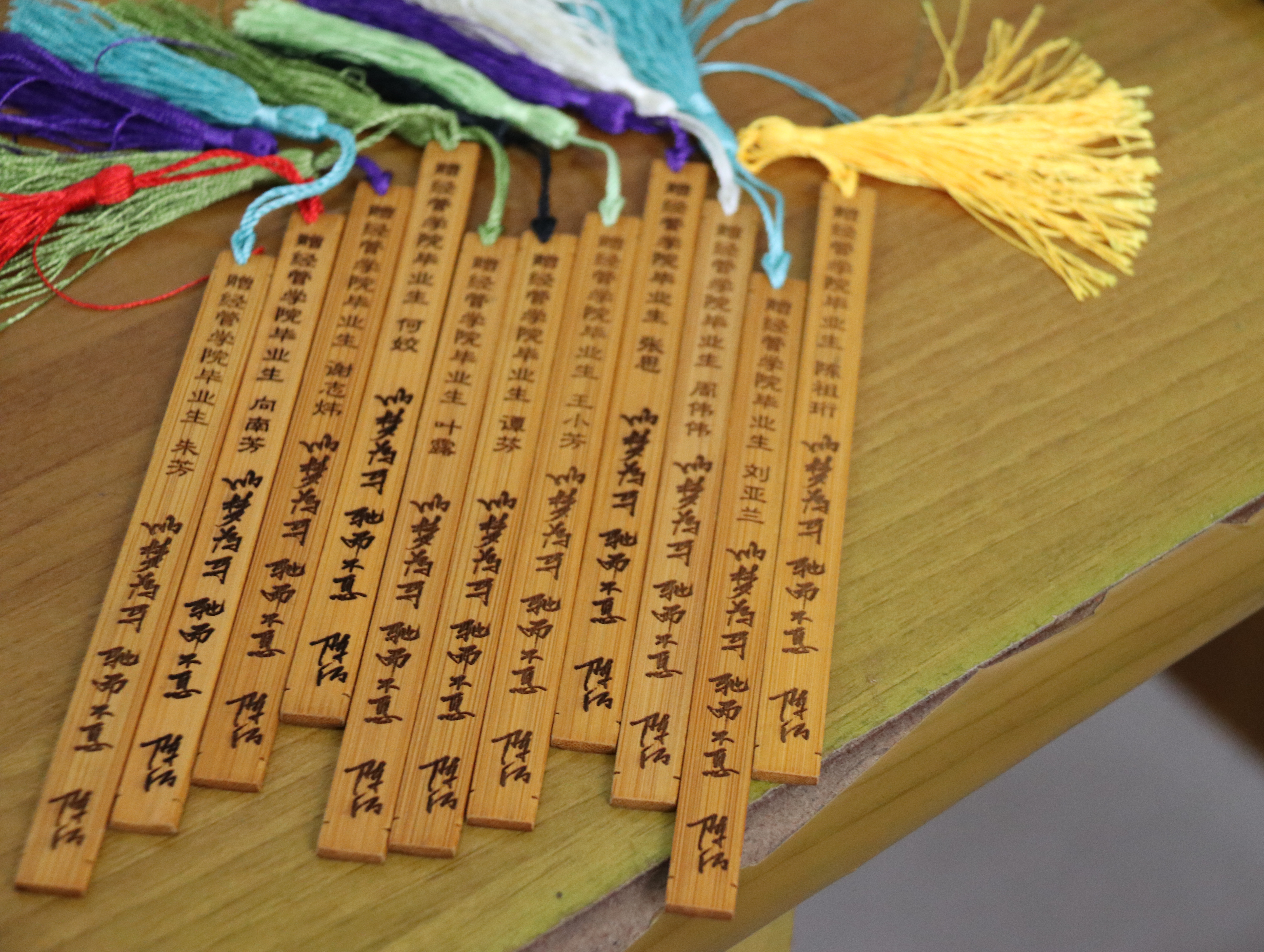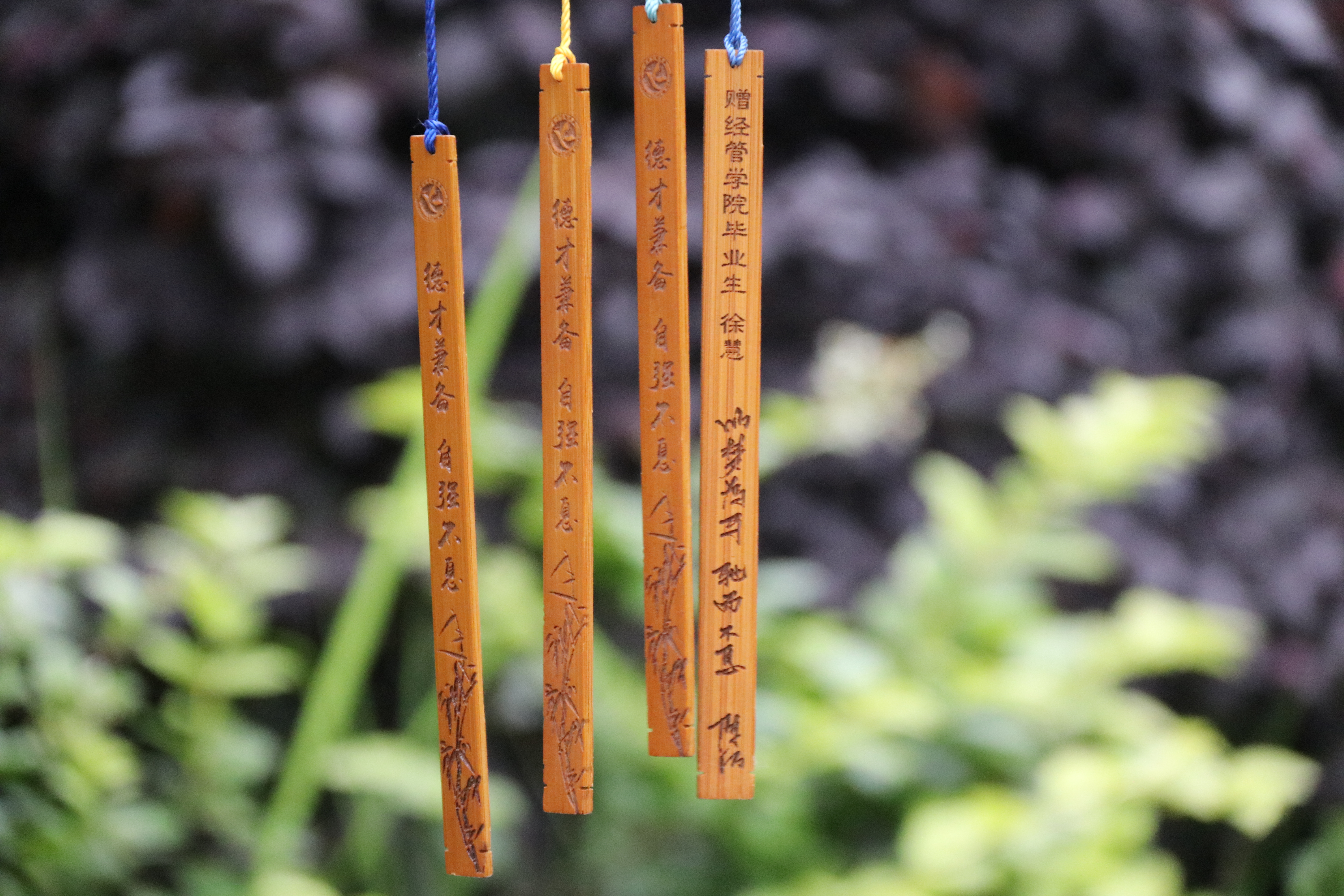 书签是木制长条形,一面刻有每一名毕业生的名字以及校党委书记陈弘书记“以梦为马,驰而不息”的寄语,希望每一位毕业生都能够怀着自己的梦想,永不停歇的愿望;另一面刻着Beat365唯一官方网站的校徽和“德才兼备,自强不息”的校训,同时还刻有竹叶,寓意着挺拔洒脱、正直清高的品质。