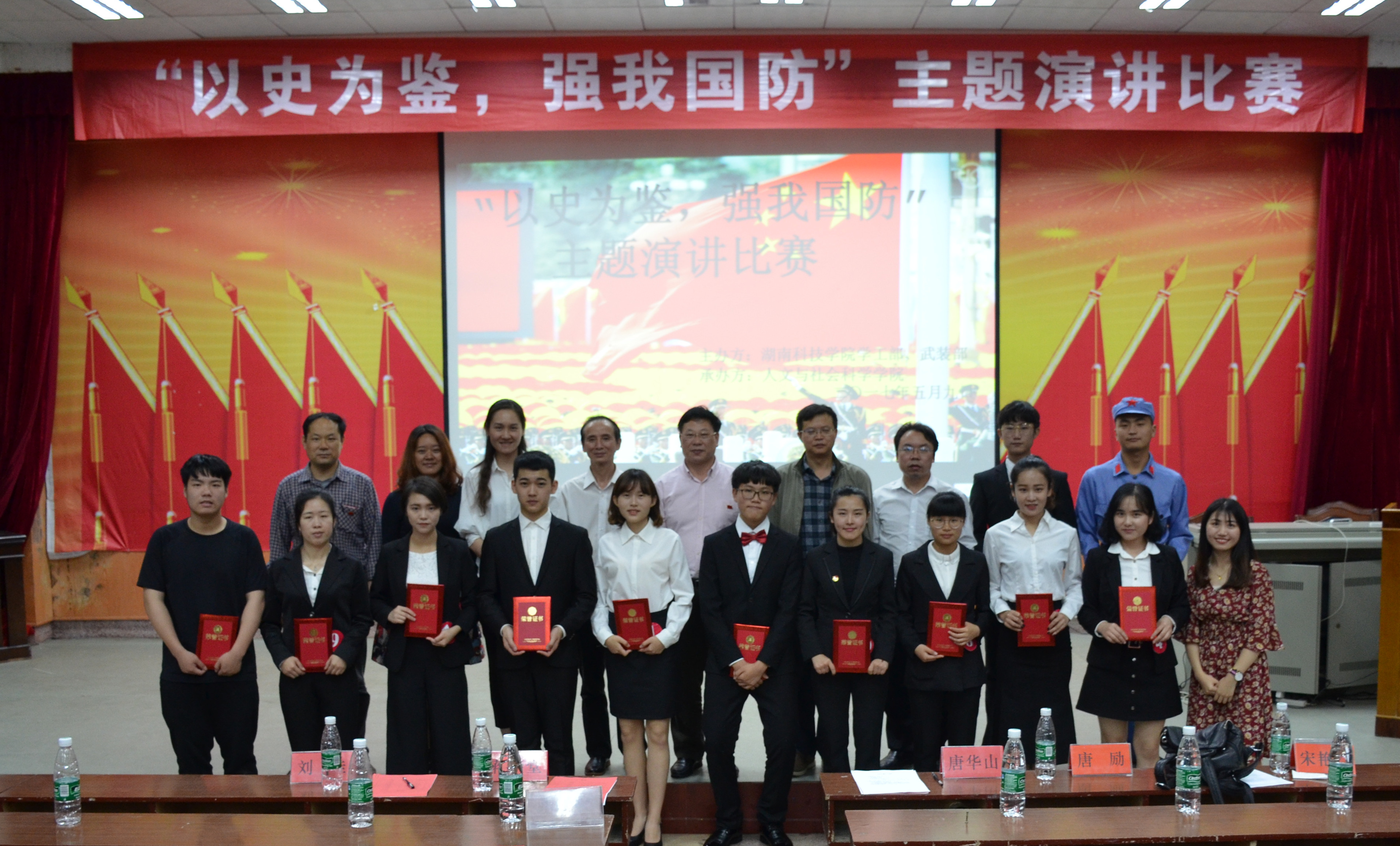 本网讯 维护国家荣誉,激荡中华荣耀。5月9日,由学工部、武装部主办,人文与社会科学学院承办的“以史为鉴,强我国防”主题演讲比赛在明德楼报告厅一楼举行。校学工部部长唐华山、校团委副书记刘佳、校宣传部副部长唐励等应邀出席并担任评委;人文与社会科学学院院长潘雁飞、党总支书记谷显明以及各教学学院的辅导员观看了比赛。