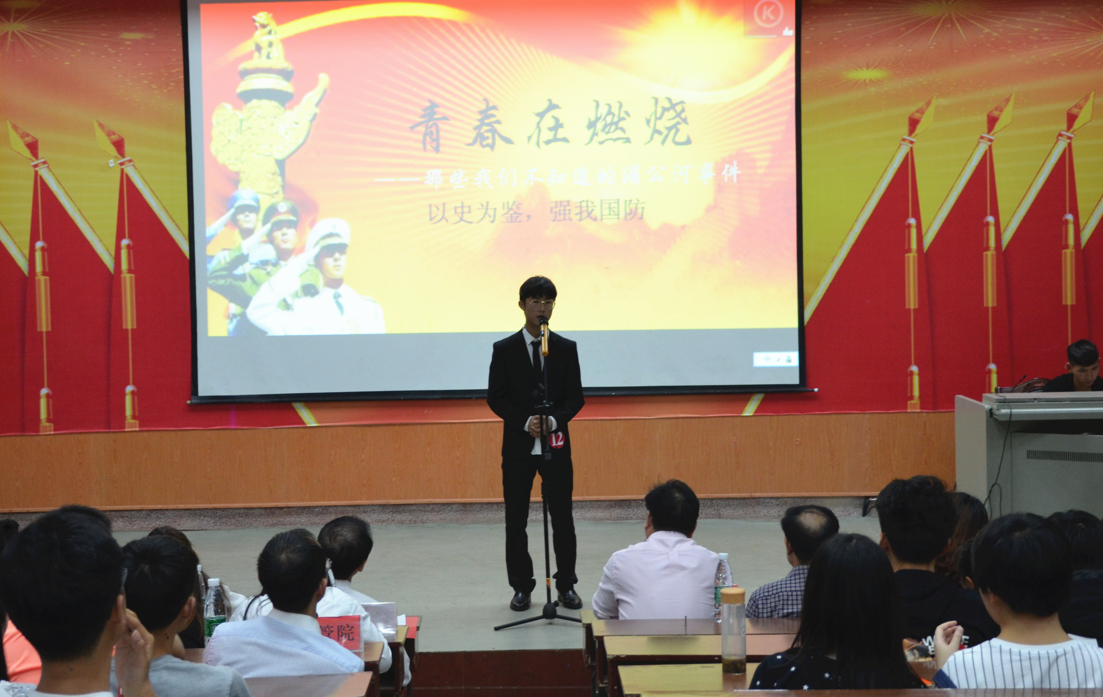 比赛在一段斗志昂扬的国防教育宣传片中拉开序幕,来自不同院系的十二位选手纷纷用铿锵有力的语言从各个角度阐述了自己对国防的认识和理解。一号选手黄鹂从抗战老兵事迹出发,讲述了一个军人坚韧感人的中国魂,使全场观众为之动容。十二号选手张文瑞则引用热点事件为切入点,深入阐述了国防对于一个国家的重要性,获得了评委老师的好评。而十号选手侯胄更是用慷慨激昂的语言作了“心系国防,共筑长城”的主题演讲,赢得了现场的阵阵热烈掌声,最终以94.5的高分夺得了本次比赛的冠军。