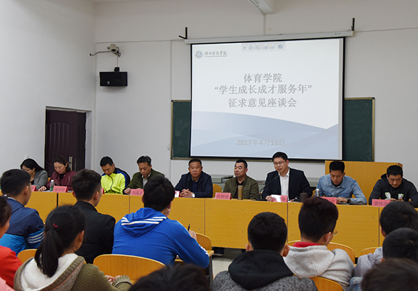 本网讯 4月11日下午,体育学院在训练馆四楼多媒体教室召开“学生成长成才服务年”征求意见座谈会。该院领导班子成员、系部主任、辅导员、学生干部代表和学生代表参加等出席座谈会。