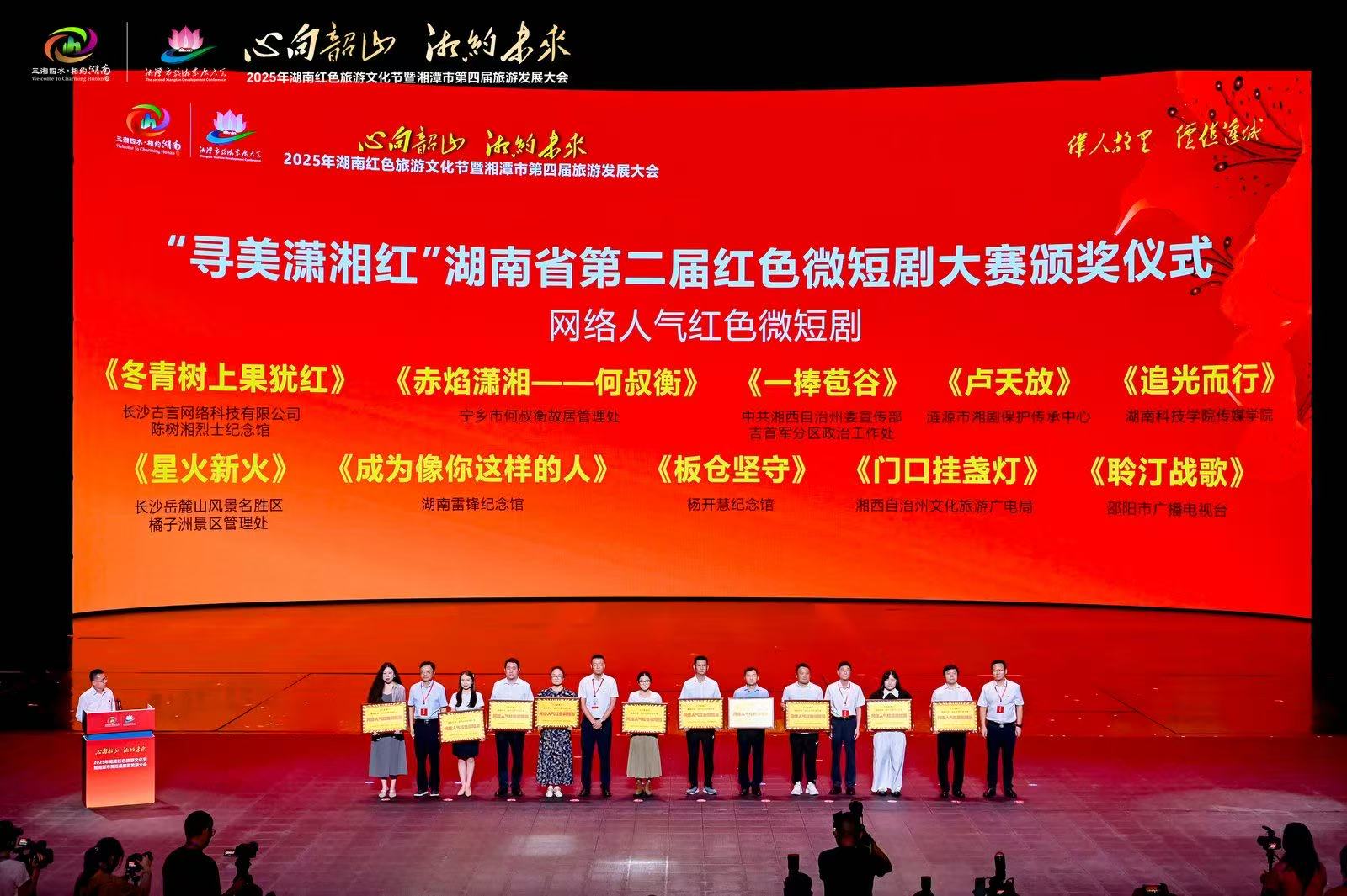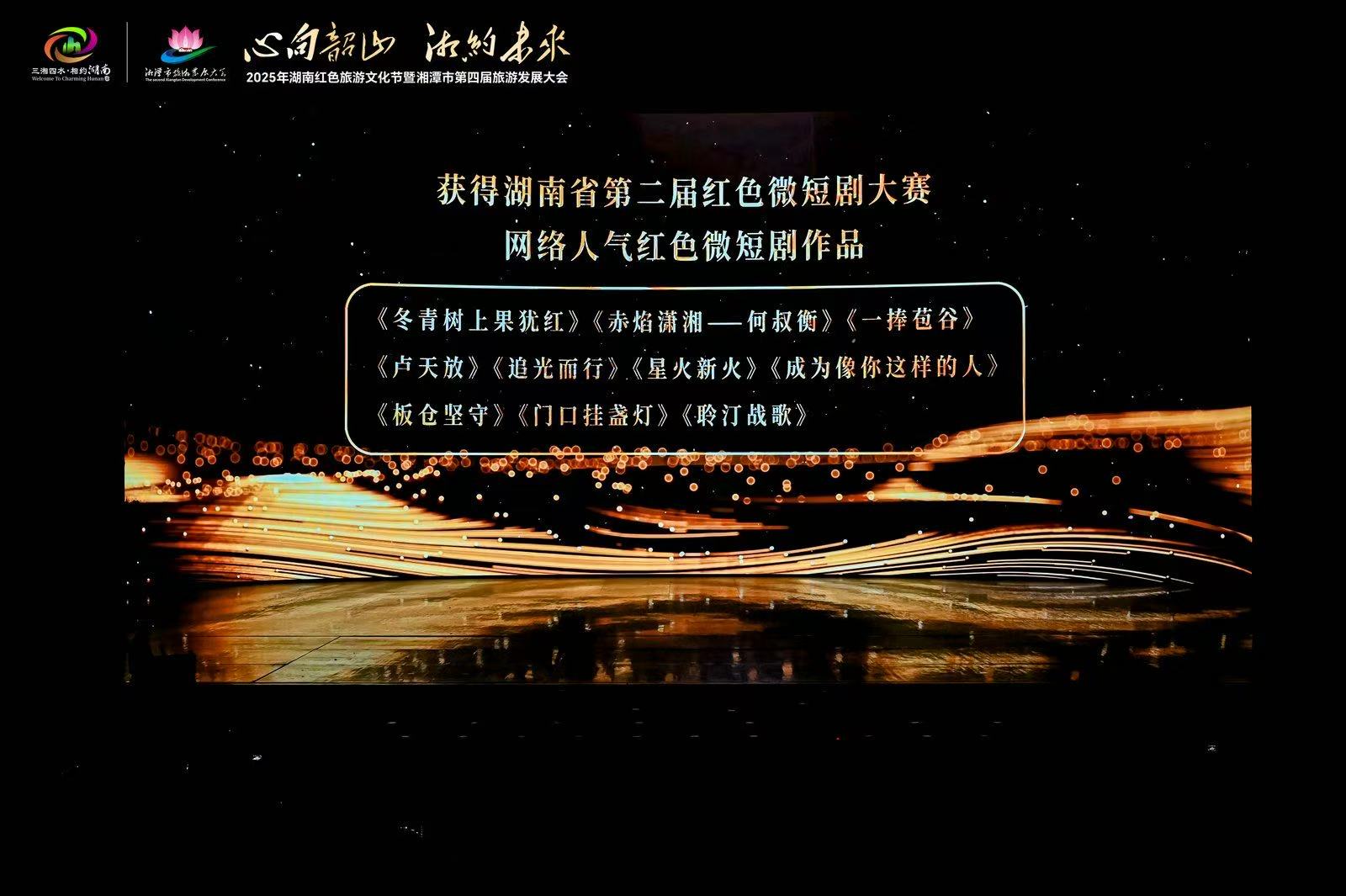 本网讯(通讯员 喻烨)7月11日,2025年湖南红色旅游文化节暨湘潭市第四届旅游发展大会在伟人故里韶山盛大开幕。开幕式上,“寻美潇湘红”湖南省第二届红色微短剧大赛颁奖仪式备受瞩目。我校传媒学院2022级学生曹思思、喻烨、何姿英、李曼姝、蒋文芳创作的作品《追光而行》荣获“网络人气红色微短剧”奖,成为全省唯一高校获奖作品。