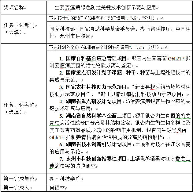 根据湖南省农业农村厅办公室《关于开展2019-2021年度全国农牧渔业丰收奖申报工作的通知》要求,现对我校何福林申报的项目《生姜姜瘟病绿色防控关键技术创新示范与应用》进行公示三天(4月25日至27日),如有异议,请在公示期内到科技处实名进行反映。