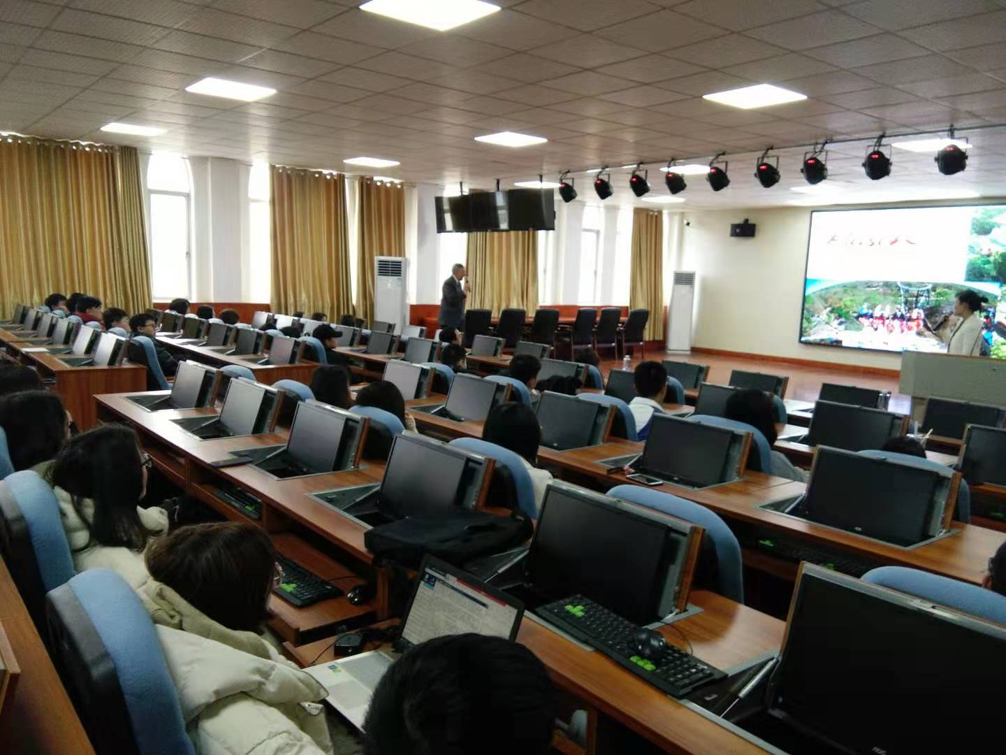 洽谈会后,William A. Becker博士一行莅临学院交流指导,并在明理楼702为我院与经管院共计120余名2016级同学就赴美专业学习与带薪实习项目的意义、岗位设置、课程设置、生活状况、安全保证、福利待遇等事宜进行宣讲、答疑。