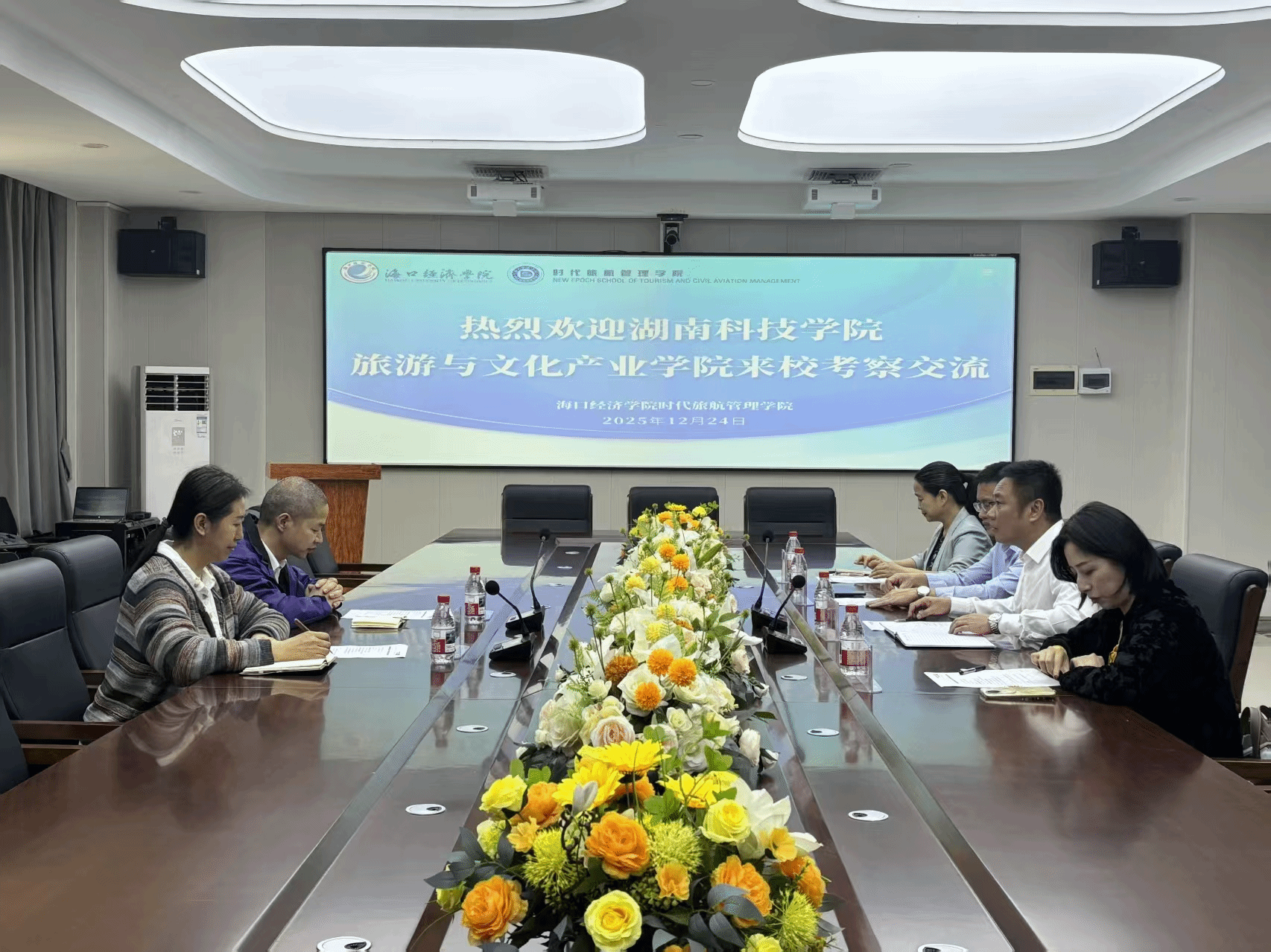 2025年12月24日上午,副院长姚先林、旅游管理系主任李晓红一行前往海口经济学院时代旅航管理学院进行考察交流。据悉,该学院有25年办学历史,开设旅游管理(数字文旅)、旅游管理(智慧旅游)、酒店管理、交通运输(民航运输)、航空服务艺术与管理等5个本科专业及方向,在校师生2000余人,拥有国家级一流课程1门,国家级虚拟教研室1个,海南省特色重点学科1个,毕业生常年供不应求。