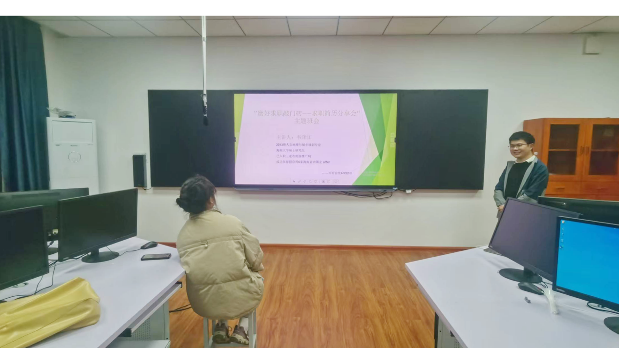 本次班会首先由韦泽江老师分享个人经验、讲述如何制作简历、现场修改简历以及指导投递简历四个方面和同学们分享如何作好一份优质的个人简历,在分享过程中与同学们积极沟通交流,切实解决同学们在个人简历制作中遇到的问题,最后由吴宇辉老师总结本次分享会的成果,并鼓励同学们制作高水平的个人简历为以后的求职道路打好坚实基础。