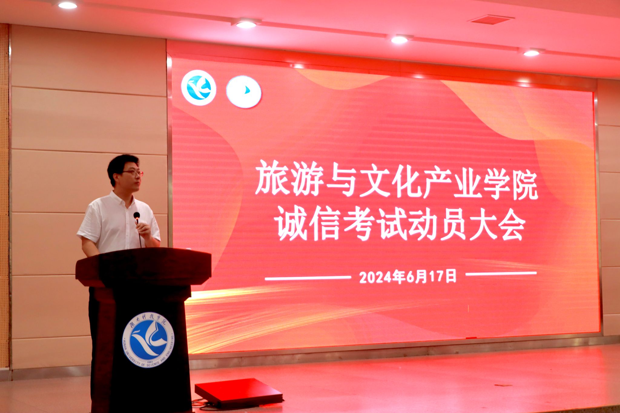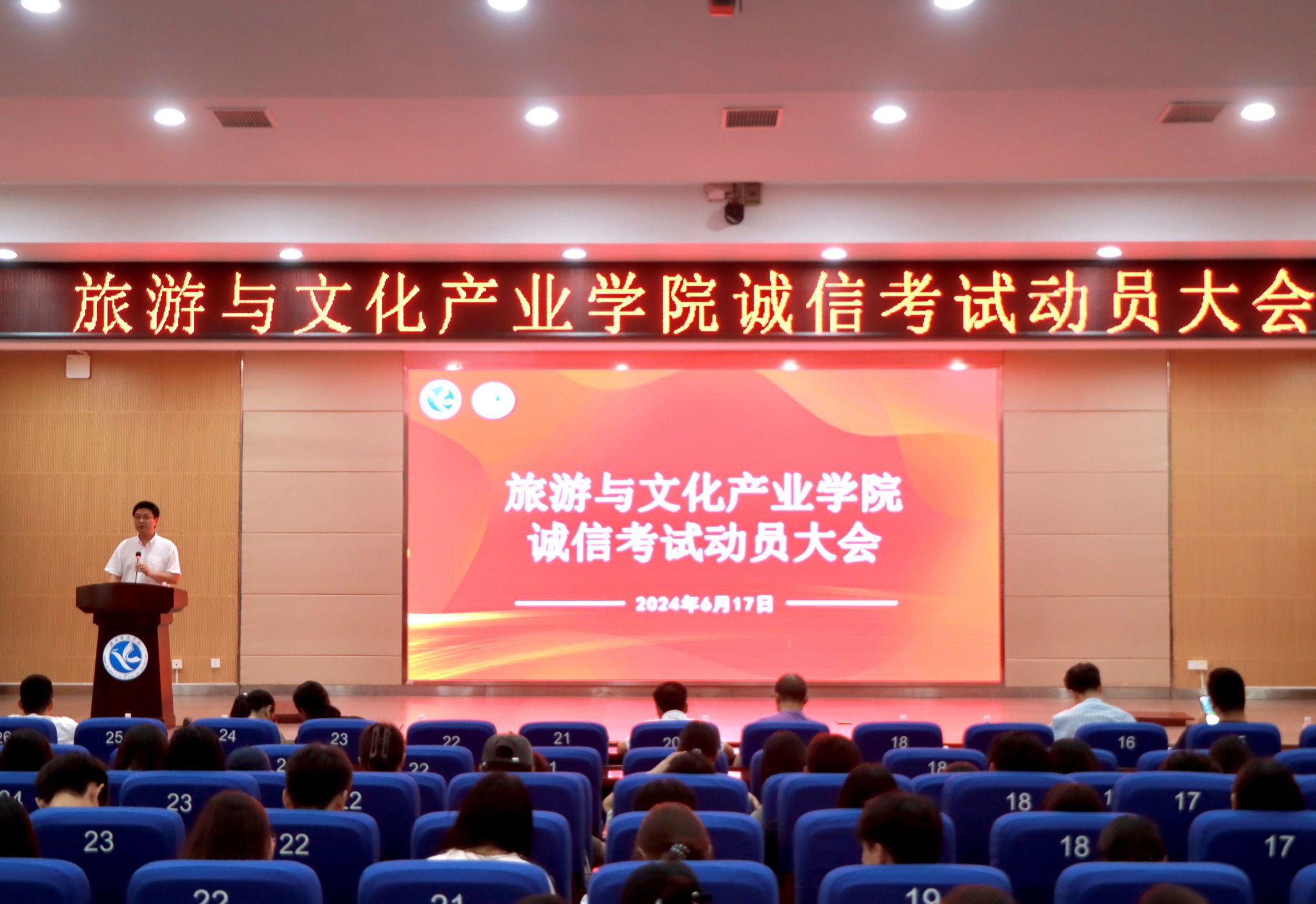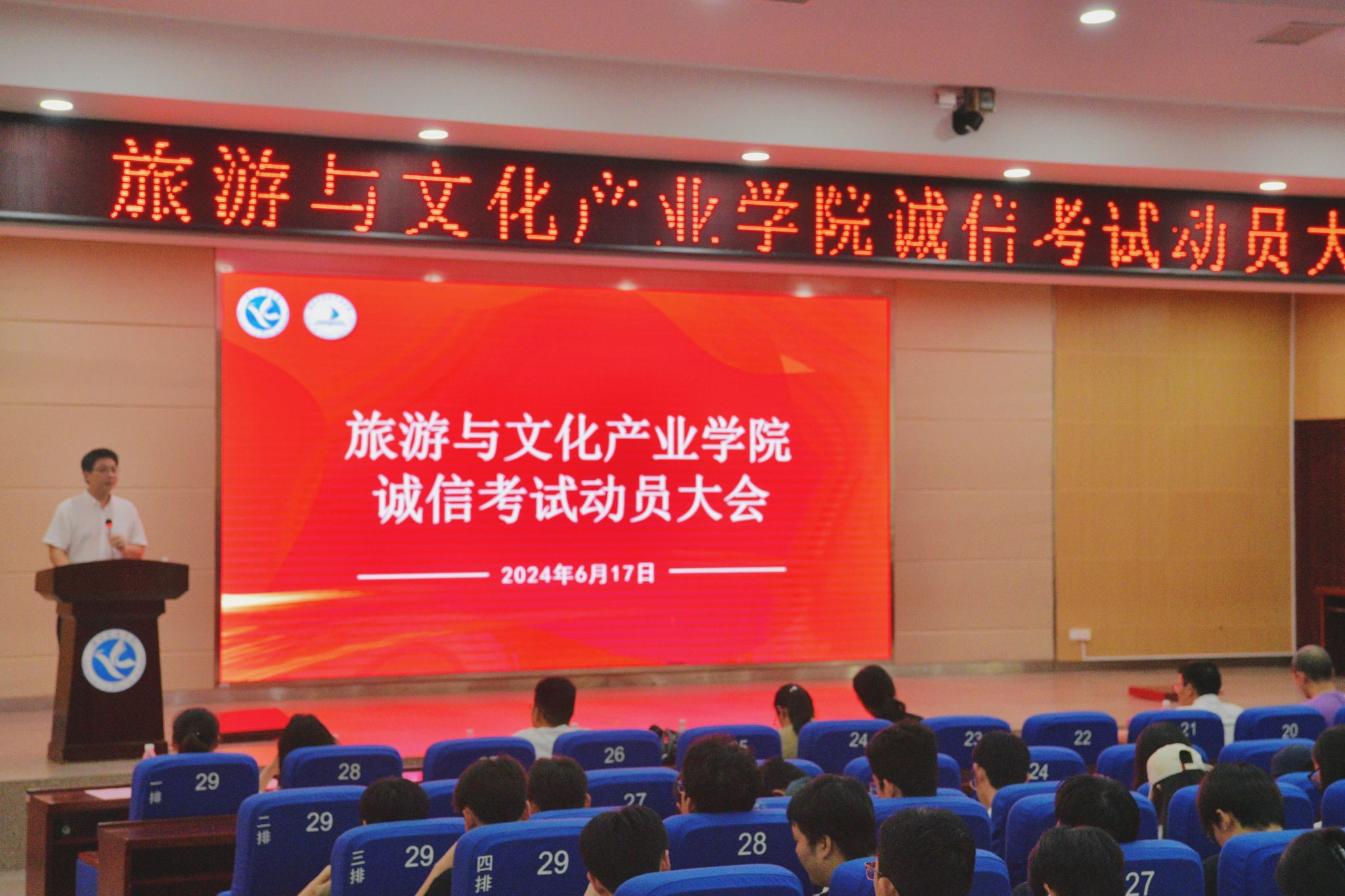本网讯(通讯员:郭扬)2024年6月17日晚,旅游与文化产业学院诚信考试动员大会在潇湘大讲堂顺利举行,学院党总支书记谢韶光、副院长姚先林,各系主任和辅导员出席。本次会议由党总支副书记周平尚主持,学院21级、22级、23级全体学生参加。