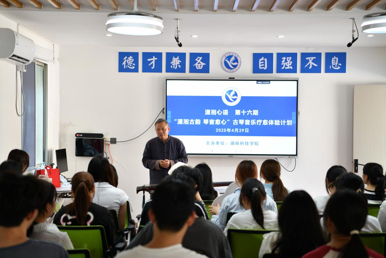 本次活动特邀永州市非物质文化遗产九疑派古琴艺术第四代传承人欧阳平彪老师担任主讲,他以深厚的专业素养,为现场师生详细讲解了古琴艺术的历史渊源及其在中医"五音疗疾"理论中的独特价值。悠扬的琴声让现场师生沉浸其中。"古琴不仅是一种乐器,更是连接古今的心灵桥梁。希望通过琴音,帮助同学们在繁忙的学习生活中找到内心的平静。"欧阳平彪老师在活动中表示。