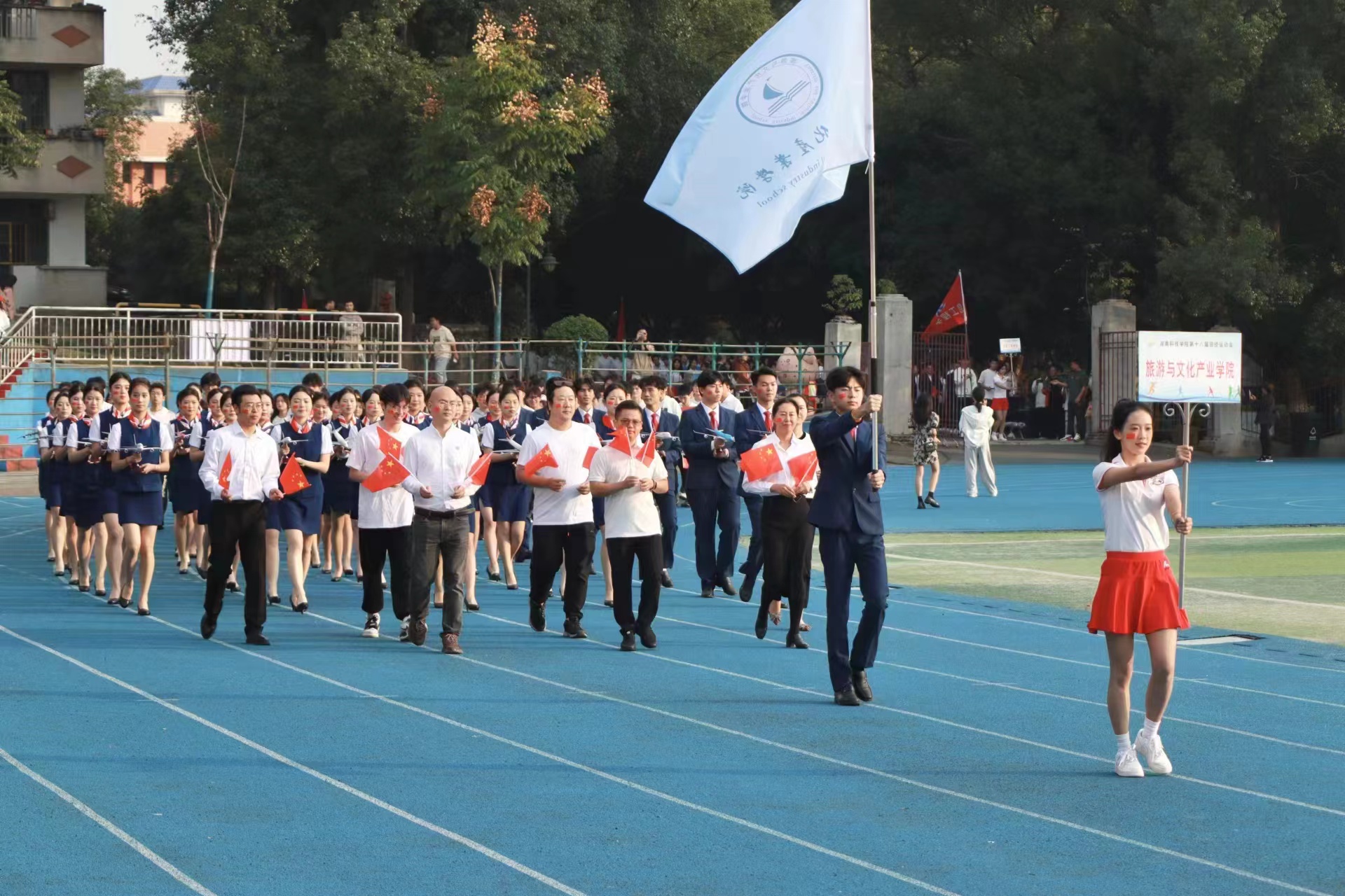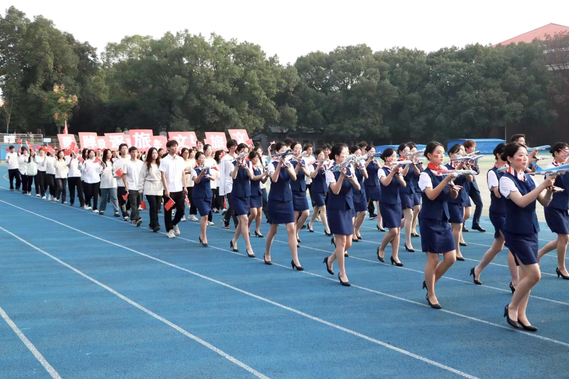 开幕式中,旅文院方阵作为首个学院方阵率先入场,向全校师生展示了我院的人文风采和精神风貌。方阵中,我院学子手持飞机模型,步伐一致,目光坚定地高喊“旅文旅文,逐梦前进,踔厉奋发,勇毅前行”的口号。他们用整齐的步伐和响亮的口号诠释了青春活力和昂扬斗志。