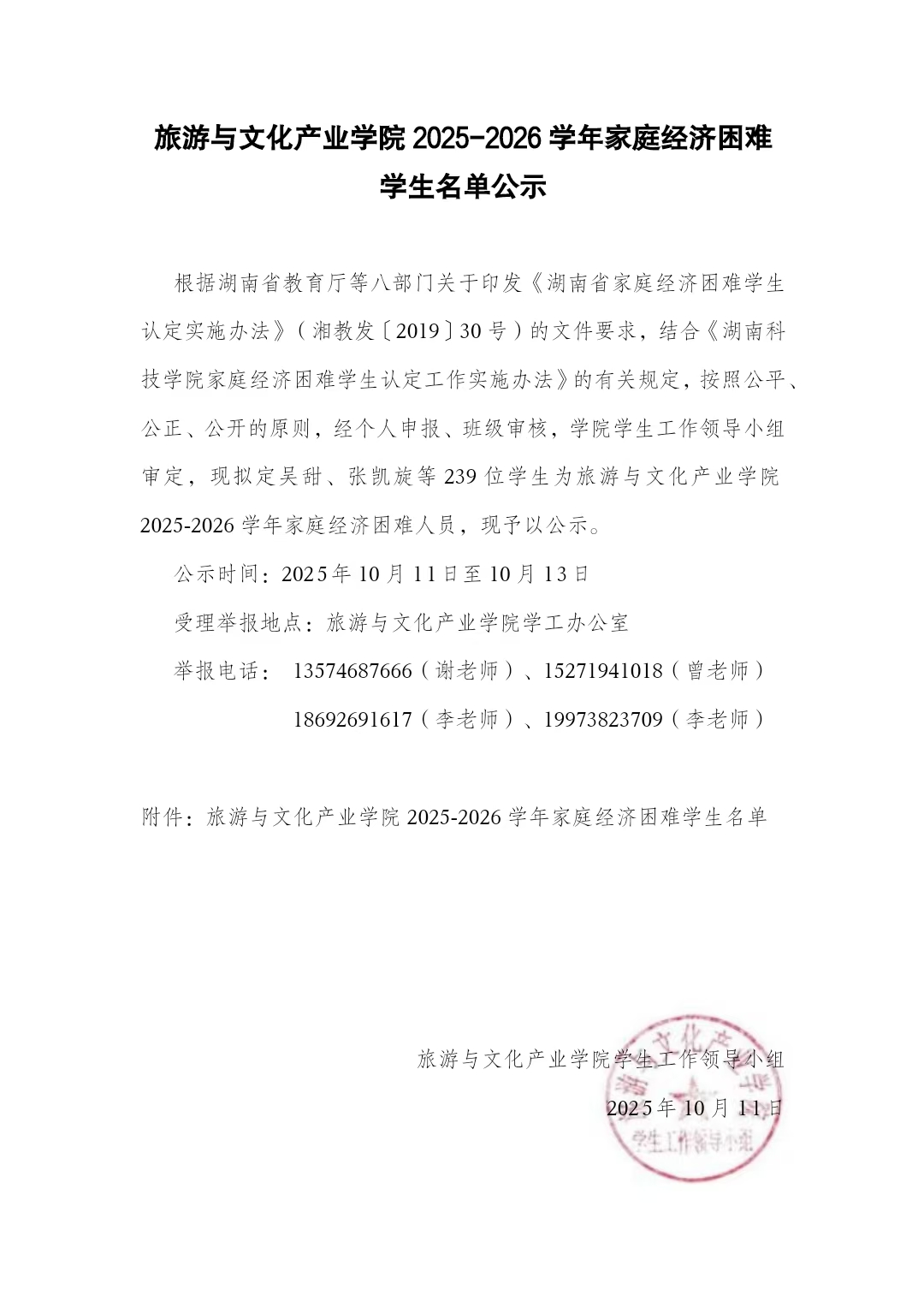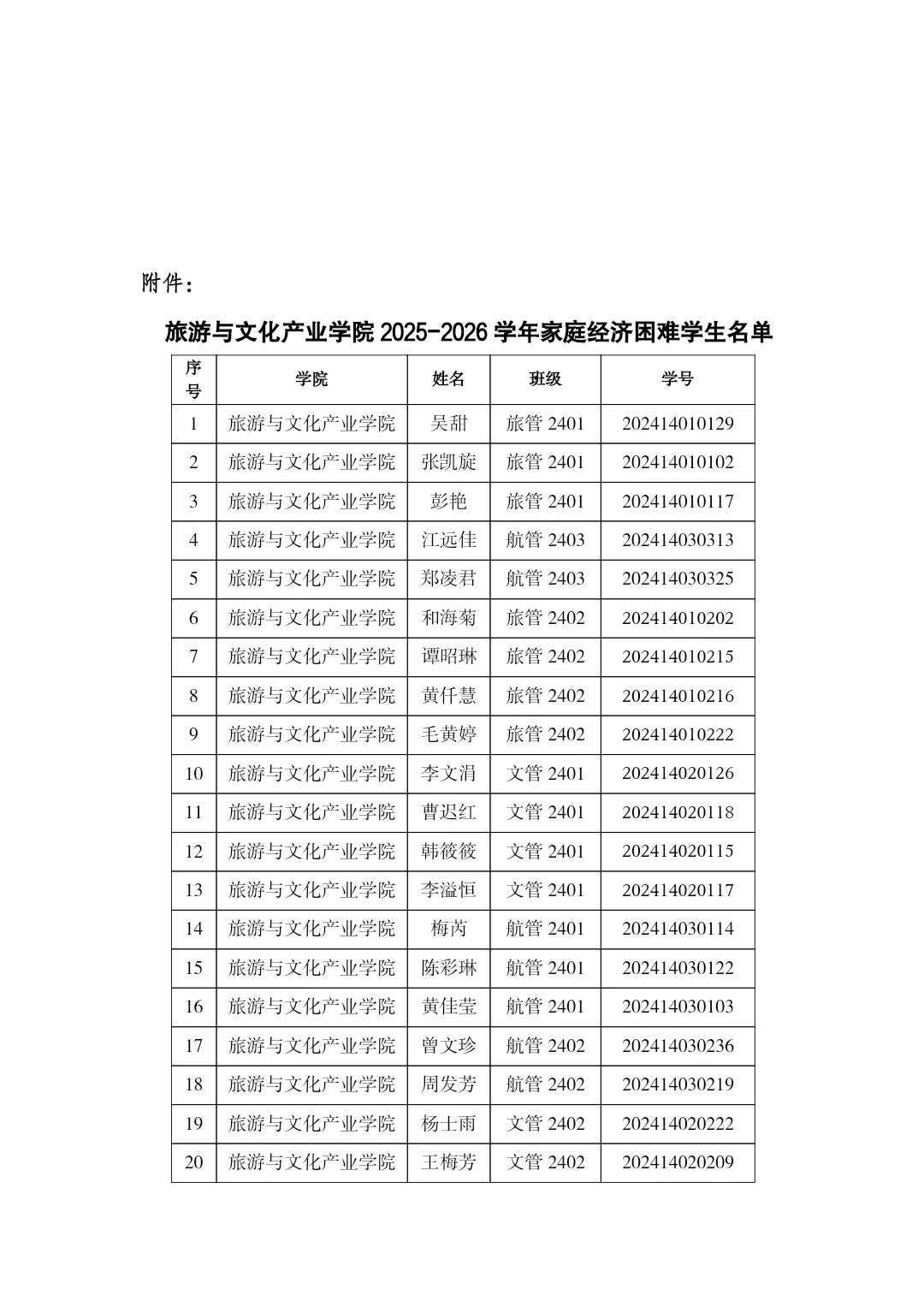 旅游与文化产业学院2025-2026学年家庭经济困难学生名单公示