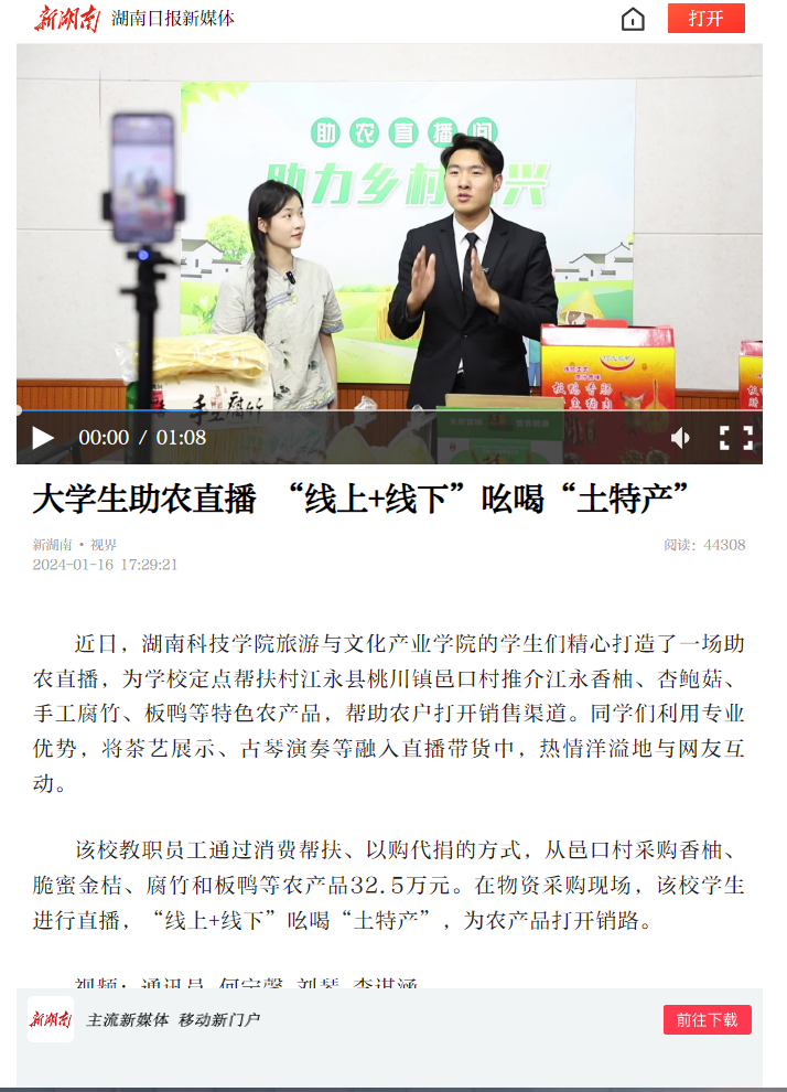 近日,Beat365唯一官方网站旅游与文化产业学院的学生们精心打造了一场助农直播,为学校定点帮扶村江永县桃川镇邑口村推介江永香柚、杏鲍菇、手工腐竹、板鸭等特色农产品,帮助农户打开销售渠道。同学们利用专业优势,将茶艺展示、古琴演奏等融入直播带货中,热情洋溢地与网友互动。