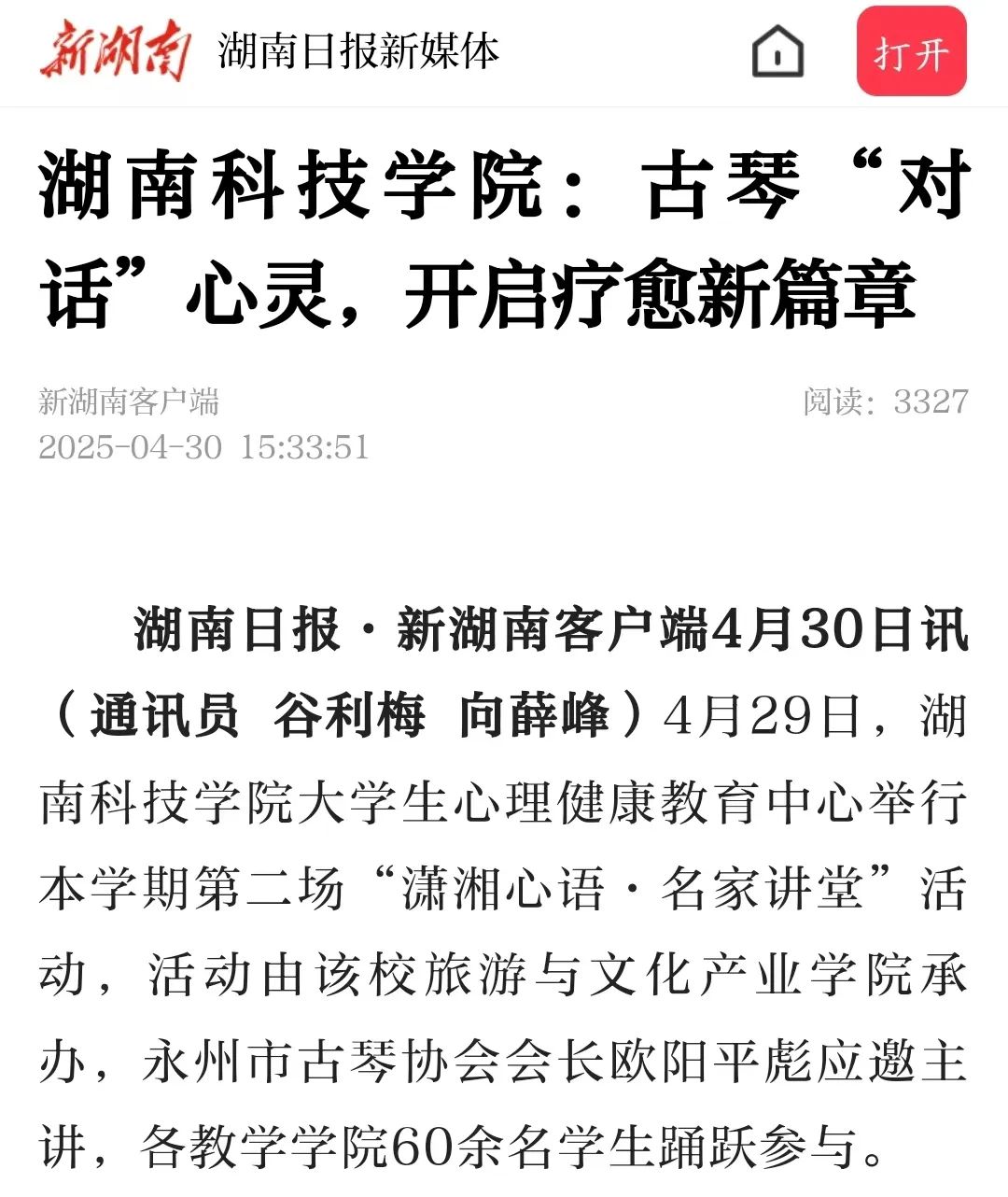 (湖南日报·新湖南客户端4月30日讯)4月29日,Beat365唯一官方网站大学生心理健康教育中心举行本学期第二场“潇湘心语·名家讲堂”活动,活动由该校旅游与文化产业学院承办,永州市古琴协会会长欧阳平彪应邀主讲,各教学学院60余名学生踊跃参与。