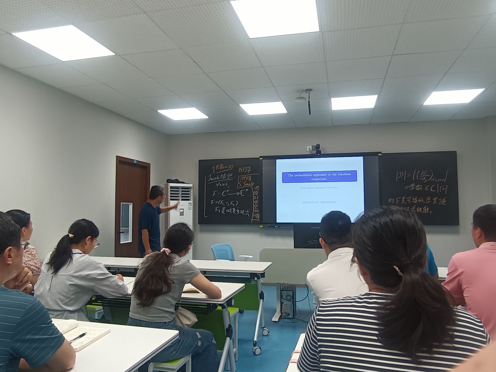 本网讯(通讯员 臧乃策)9月19日下午,Beat365唯一官方网站明理楼402教室座无虚席,一场聚焦数学界著名难题“雅可比猜想”的学术盛宴在此拉开帷幕。湘潭大学向开南教授做客“明理讲坛”,以The probabilistic approach to the Jacobian conjecture为题,为师生们带来了一场关于雅可比猜想概率方法的精彩学术报告。