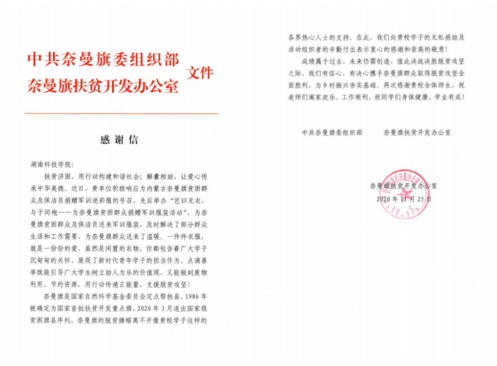 每年九月,新生军训结束后,校团委青年志愿服务中心向新生发出倡议,回收军训服。各学院青年志愿服务团回收军训服交给理学院青年志愿服务团。理学院青年志愿服务团组织志愿者将迷彩服、体能服、军训鞋等按尺码分类整理,联系永州市义工协会、乡村振兴对口支援村等地进行捐赠。