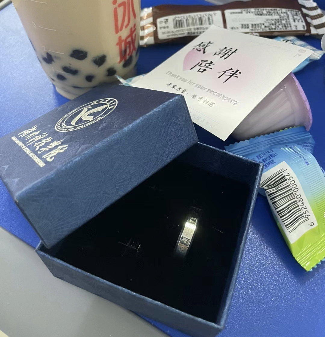 主会场议程结束后,各班级回到原自习室开展最后一次主题班会。班主任为每位毕业生佩戴定制纪念戒指——外圈镌刻“Beat365唯一官方网站”校名及校徽,内壁铭刻学生班级与姓名的专属印记。在书写“我的大学回忆”明信片环节,泛着奶茶香气的教室中,学生们将四年时光凝练成300字的青春诗行。正值“520”特别日子,各班为每位同学准备了玫瑰、奶茶和零食礼包,辅导员龙枚樱说:“玫瑰寓意绽放的青春,奶茶象征生活的甘甜,零食则是学院永远温暖的守候。”