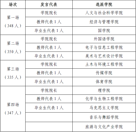 5. 请各学院根据发言代表安排(见后面表格),做好通知或选派工作,准备好发言稿,其中学院院长讲话建议围绕“祝贺、感谢、祝福、期盼”等主题,要有广泛代表性,不能局限于本学院。