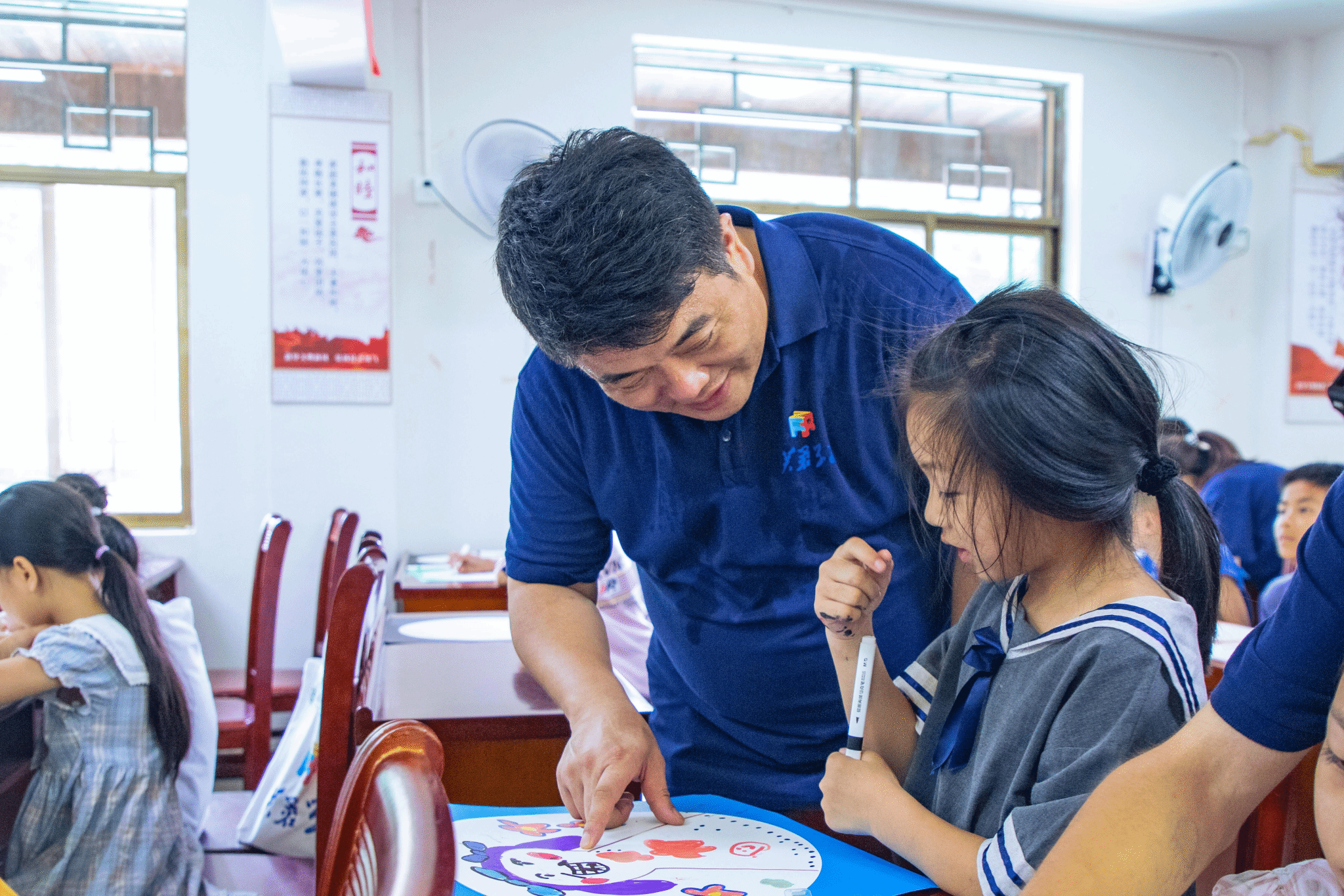 随后,向阳花队的志愿者们与孩子们携手,一边交流一边在方圆卡纸上精心绘制出“情绪头像”。一笔呈表情,一笔注情感,让孩子们尝试情绪表达,学会传递和交流情绪。一幅画作,一种色彩都蕴含着孩子们的真情实感,志愿者的帮辅让他们积极乐观、自我悦纳,学会了情绪调节的方法,在一片欢声笑语中健康成长。