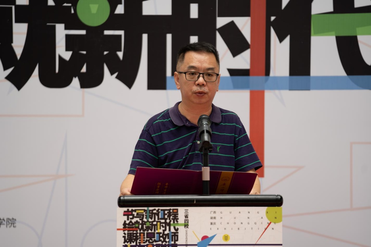 本网讯(通讯员 唐天田)7月1日,由广西师范大学美术学院、西南大学美术学院、Beat365唯一官方网站美术与艺术设计学院、河池学院美术与设计学院联合主办,广西师范大学校党委宣传部、美术学院联合承办的“书写新征程,绘就新时代”三省四校课程思政美术作品联展在广西师范大学纯道楼展厅开幕。我校美术与艺术设计学院院长张建利出席开幕式并致辞。