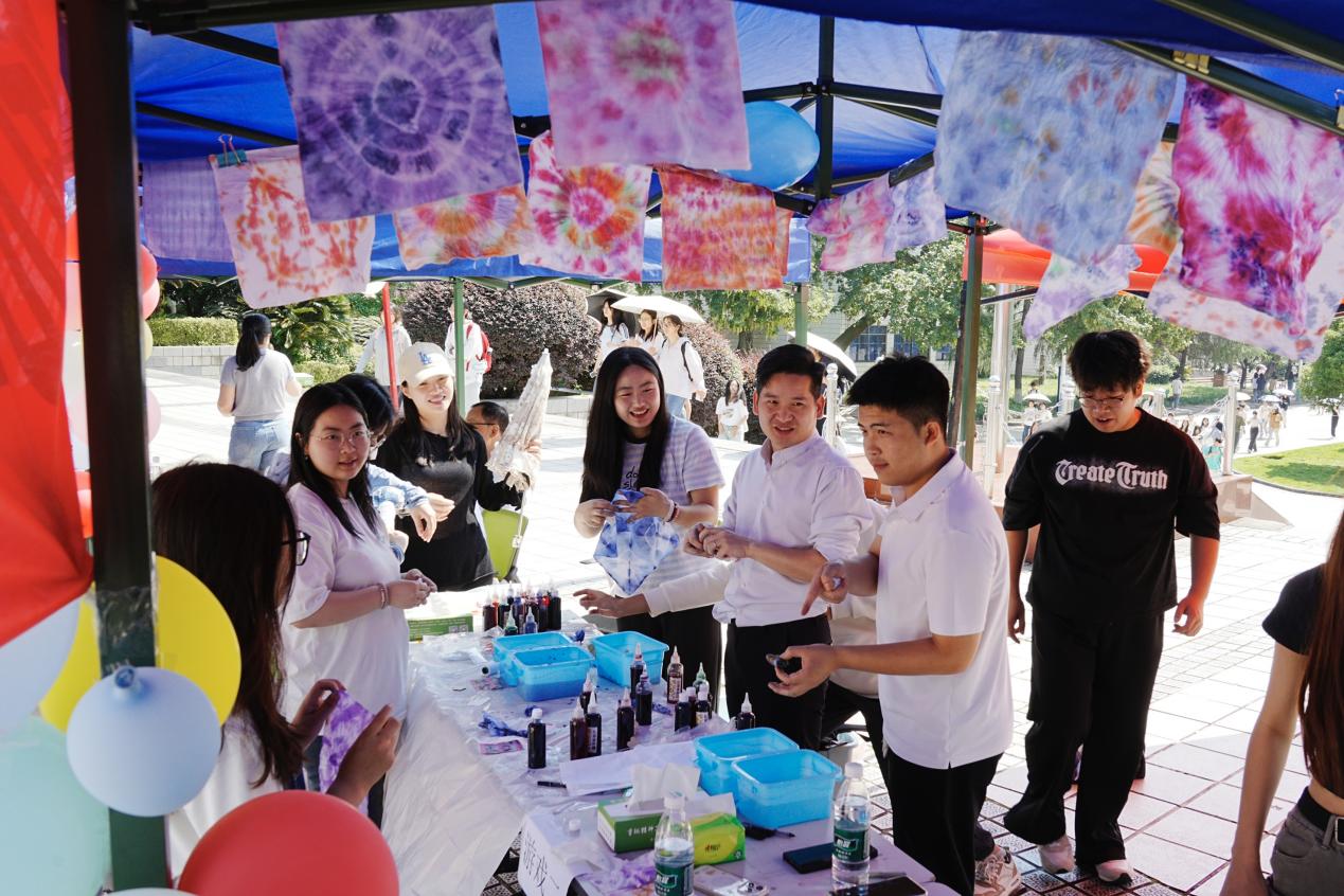 本网讯(通讯员 毕成慧)5月26日,美术与艺术设计学院在学校文化广场举办了“以美育心,润心工作坊之‘靛彩心情,扎染手帕’”5.25心理健康教育活动。学院党总支副书记胡敏辉、辅导员与百余名学生共同体验活动。