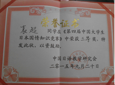 本网讯 近日,在第四届中国大学生日本国情知识竞赛中,我校外国语学院日语专业1201班袁超、陈静在与来自上海外国语大学、武汉大学等28所高校中的56名参赛选手中脱颖而出,分别以第7名和第13名的成绩荣获三等奖和敢斗奖。