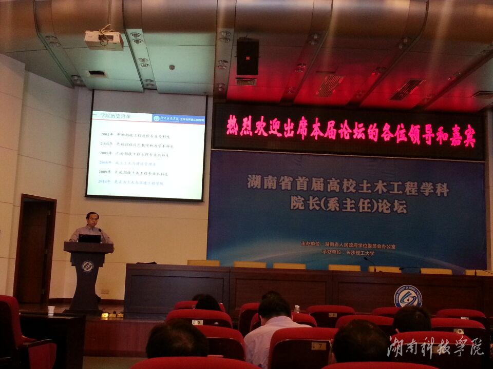 湖南省教育厅党组成员、副厅长葛建中和省交通运输厅副巡视员徐建出席论坛并讲话。论坛邀请了中国工程院杨永斌院士,同济大学、东南大学、长安大学和省内18所具有土木工程专业本科院校的150多名土木工程学科负责人、教师代表与会。