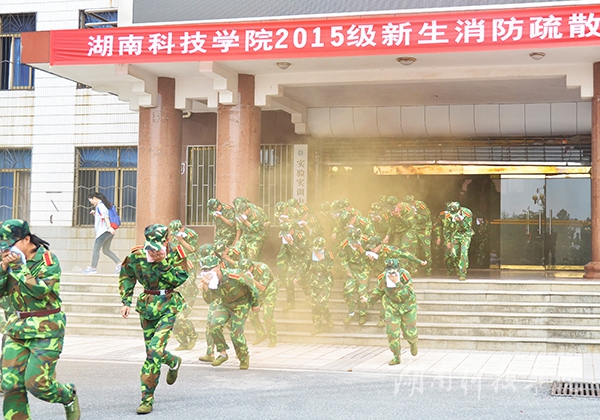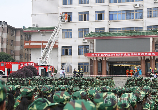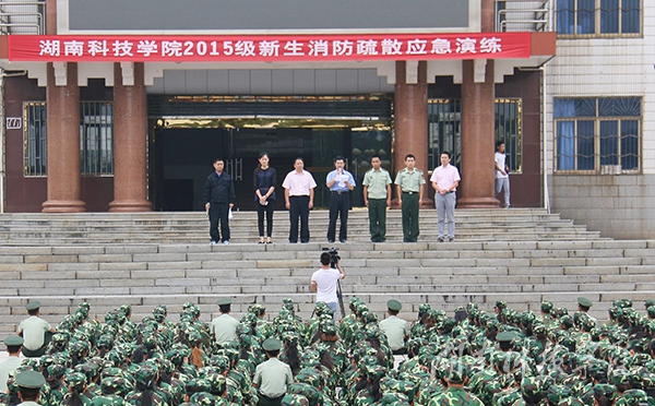 本网讯(通讯员 李斌 摄影 何帅文 刘信)“不好了,失火了!快跑!”9月21日上午,由我校保卫处联合零陵公安消防大队举行的 2015级新生消防疏散应急演练在弘毅楼举行,副校长吴小林出席。