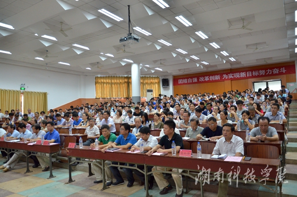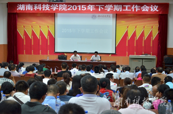 本网讯(记者 乐为 摄影 张贵)9月5日下午,学校在明德楼报告厅召开2015年下学期开学工作会议,回顾总结暑期工作,部署新学期工作。校党委书记陈弘主持会议并强调,办好高水平应用型大学总的抓手在党的建设,要致力实现学校的“四个转到”, 通过改革创新实现发展突围,凝心聚力、动心忍性,精心培育潇湘万千英才。校长曾宝成要求,紧盯目标,夯实基础,突出重点,强化内涵建设,努力建设高水平应用型大学。