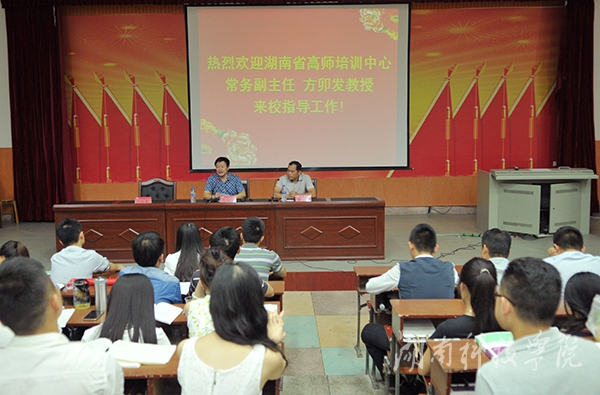 本网讯(记者 周芬 摄影 何帅文) 8月31日下午,湖南省高等学校师资培训中心常务副主任方卯发来校检查指导2015年新进教师岗前培训工作,人事处处长李勇陪同检查。