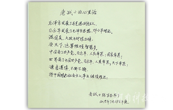 如今,老人在家安享晚年,谈起当年的峥嵘岁月,他仍然难掩内心澎湃的激情。当聊起幸福的晚年生活时,老人脸上洋溢着满意的微笑。他高兴地告诉陈弘书记:“现在的时代好,国家政策好,学校非常关心我们,我们是在享共产党的福哩!”当提及对现今时代的感悟时,老人拿出自己深夜执笔的《老战士的心里话》:“毛泽东发展了马克思列宁主义,习近平发展了毛泽东思想、邓小平理论;谋国是,大政方针很正确;安天下,运筹帷幄智慧多;中国有了共产党、习近平,人民幸甚,国家幸甚;世界有了中国共产党、习近平,人类幸甚,天下幸甚;谦虚谨慎,不骄不躁,将中国特色社会主义事业继续推进!”真心真情溢于言表,同行的我们,无不肃然起敬。